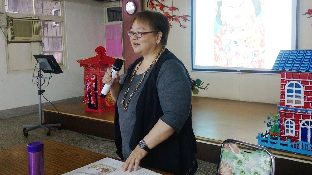 學完《弟子規》以及可配雨夜花吟唱的三字經,下半場進入台語說繪本的時間。這次因適逢每年「全台瘋媽祖」的春季,因此這天楊月燕帶來繪本《媽祖春遊趣》,希望藉由書中一家人參加媽祖遶境活動的劇情,來帶出本日的話題。