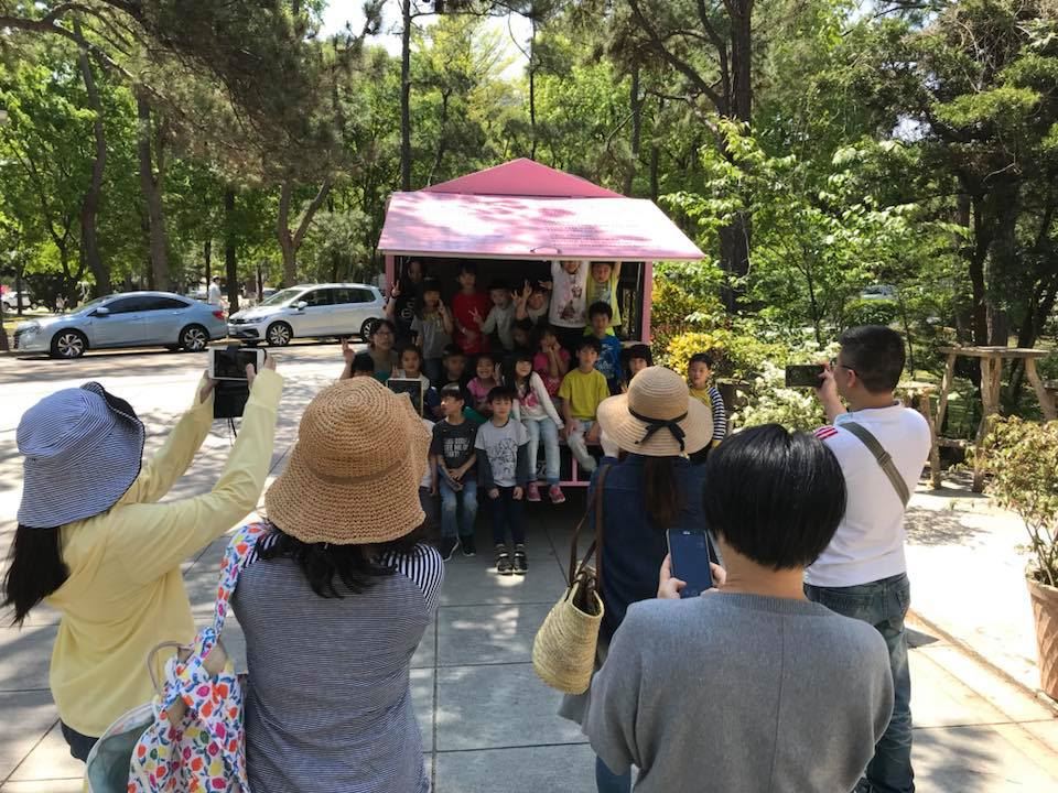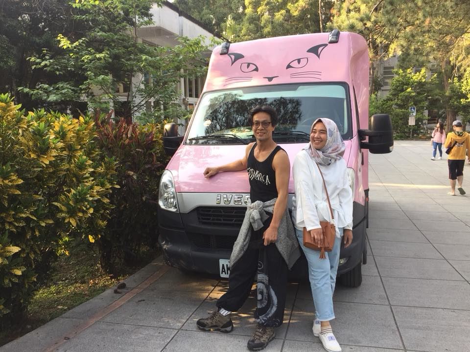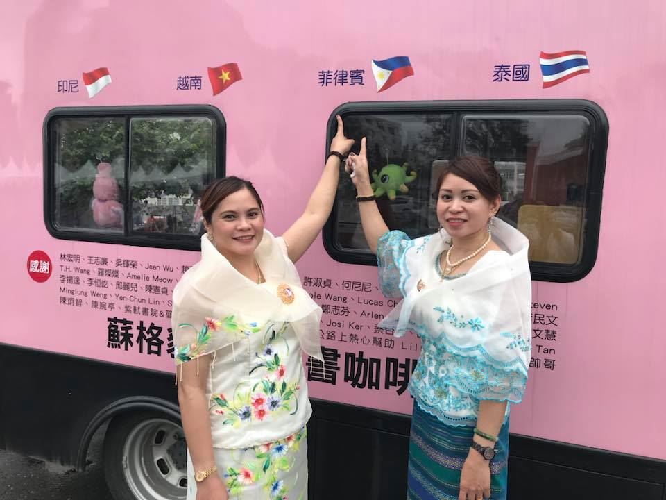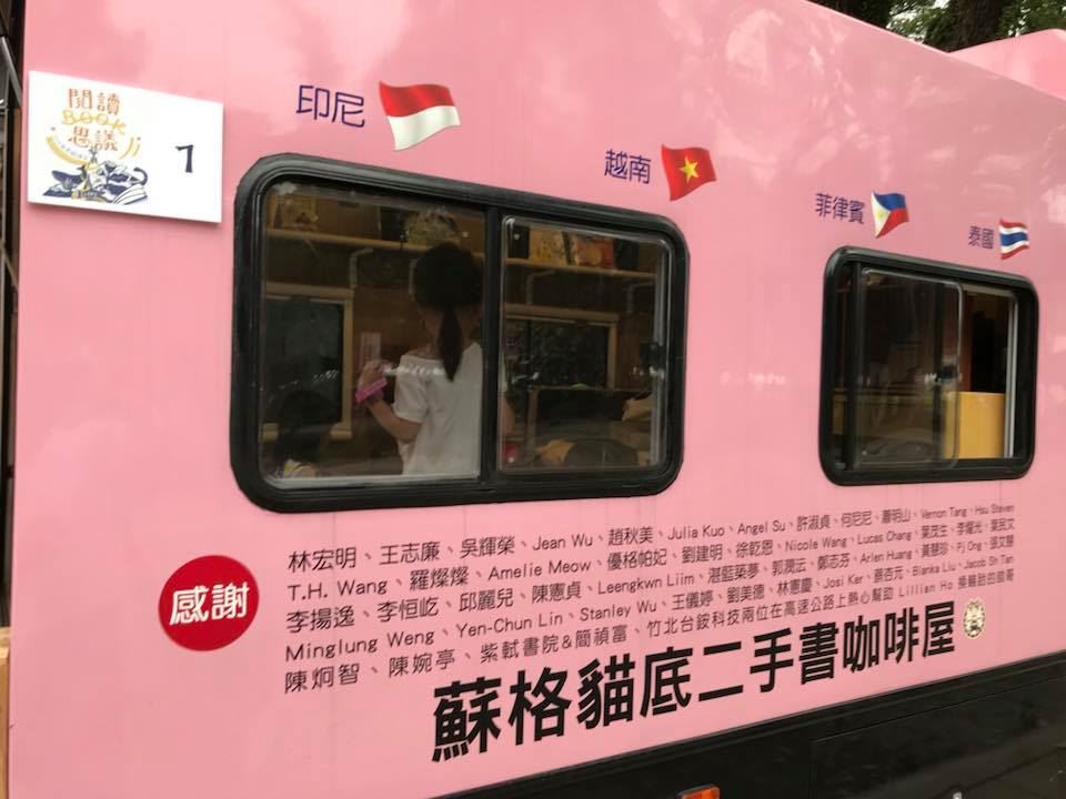 遠遠即瞧見一輛書車停放在老街入口處,亮粉紅色的外型,頭頂還有一隻可愛貓咪的圖案,讓人忍不住露出會心一笑。書架上擺放的並非我們熟悉的中英文書籍,而是少見的印尼文、柬埔寨文、越南文繪本──這是一部東南亞行動書車。
