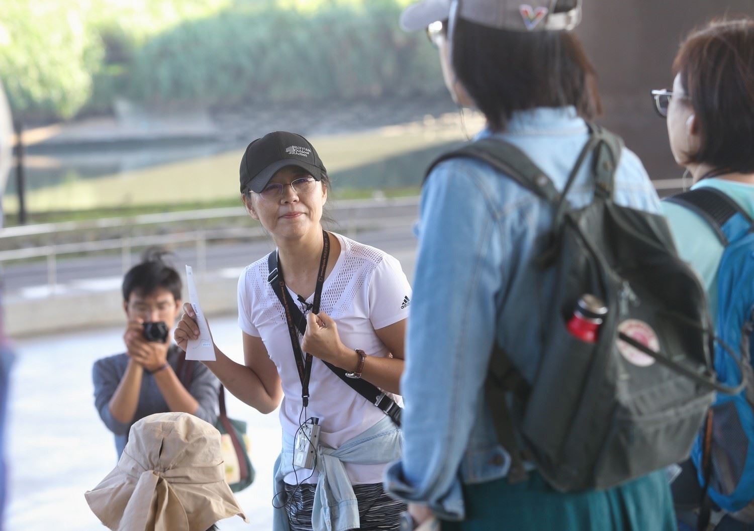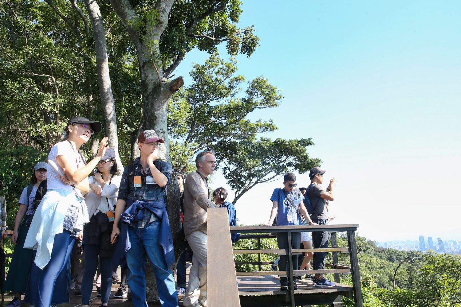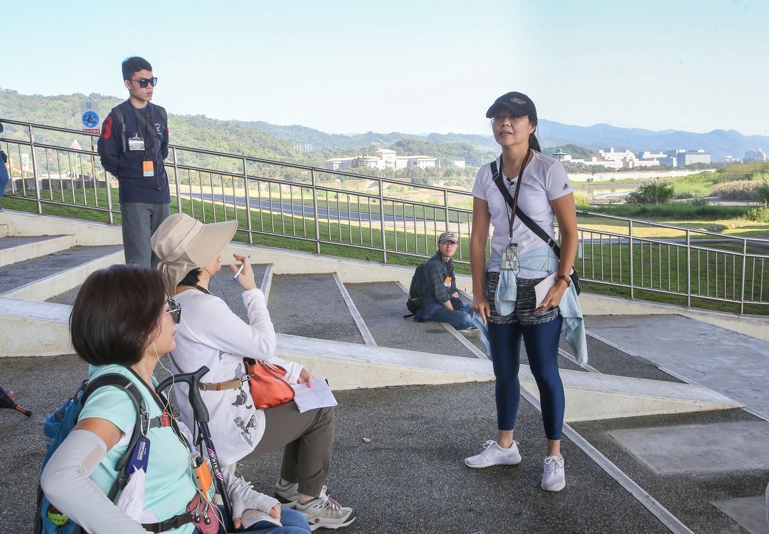 感受過後,范欽慧帶領所有人從北美館出發,徒步走過鄰近的圓山附近,路線從中山橋下到圓山風景區,從圓山大飯店到劍潭公園,在數座高架橋樑交錯上方的人行步道上,遠眺舊中山橋的橋身放置處、再春游泳池舊址,最後走到圓山遺址。