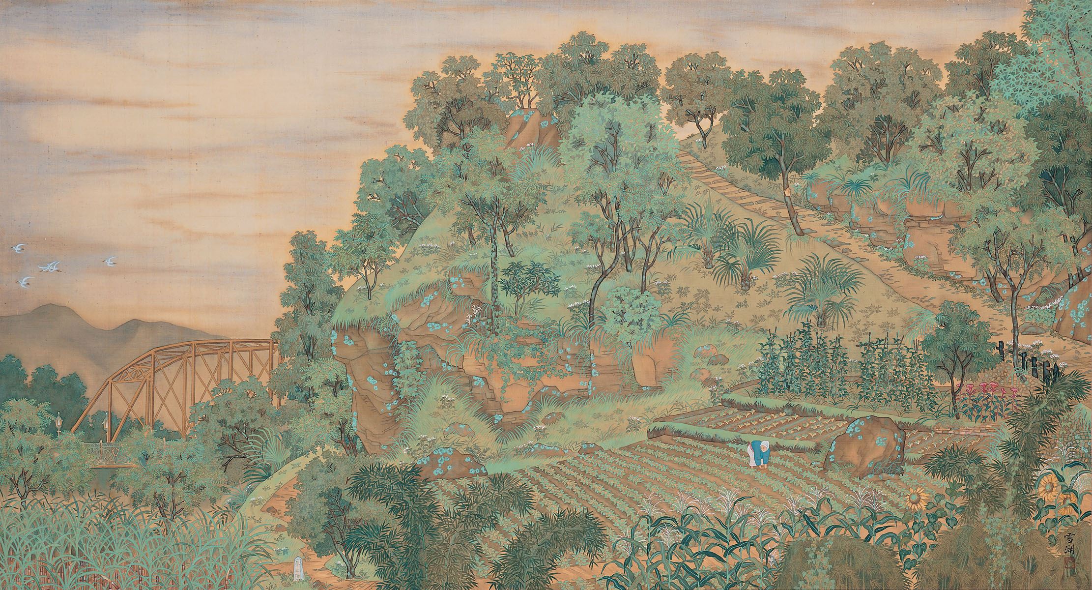 那天相約在北美館,身處飛機航道下方的我們,不時得因那些轟轟飛過的噪音而暫停對談。每一次鐵鳥飛越時的無言相對,她總會歪斜著頭,露出有點俏皮有點惱的笑,她幽幽說起北美館的館藏、郭雪湖的「圓山附近」。她說那幅畫,畫著的是北美館鄰近著圓山風景,畫面流動著一股靜謐恬適的氛圍,左方,有群飛越而過的白鷺鷥,「郭雪湖應該沒想過,經過90年,天上飛過的白鷺鷥已成了鐵鳥。呵,你聽!」她的話音未落,又一陣轟轟越過。