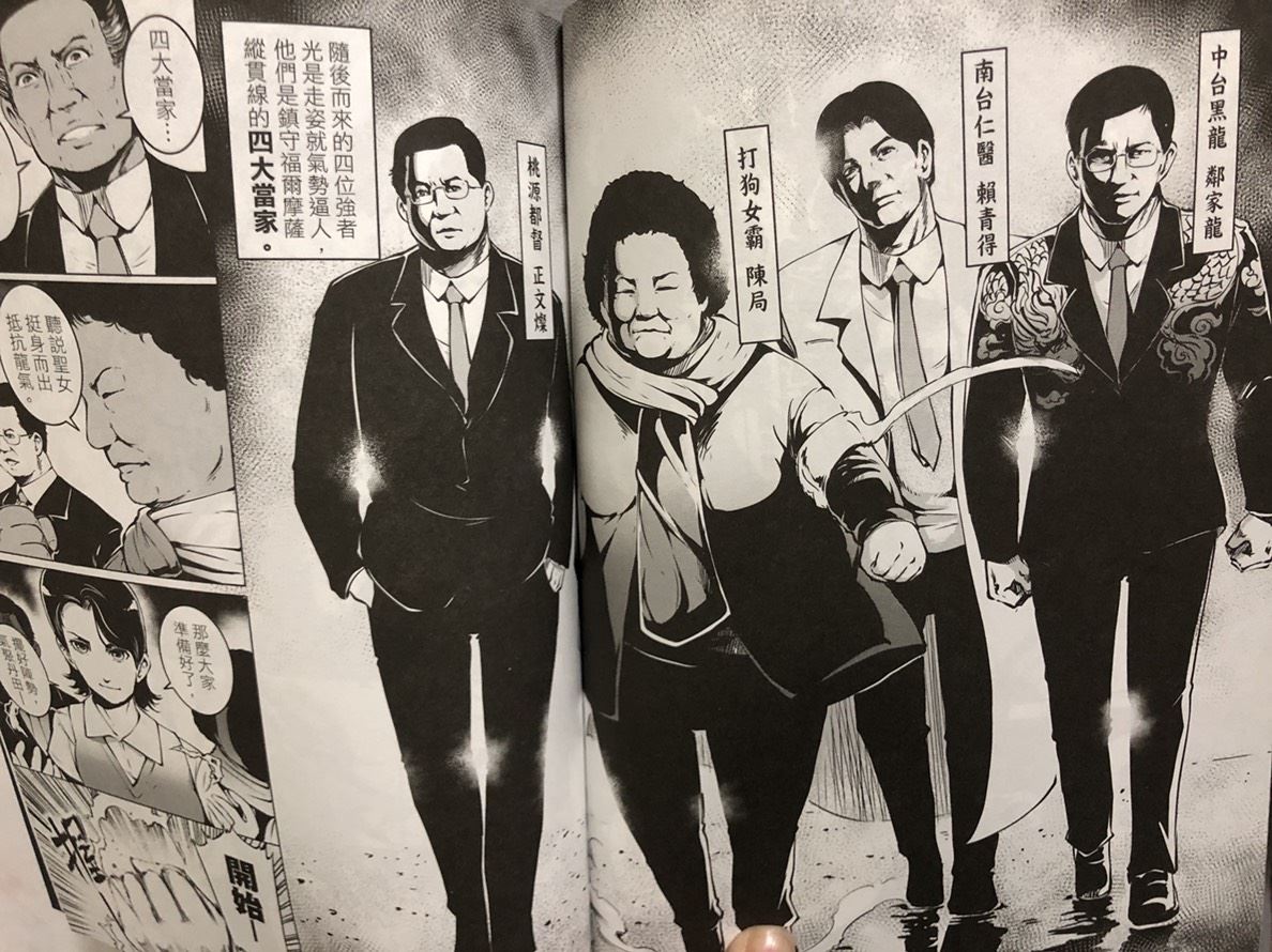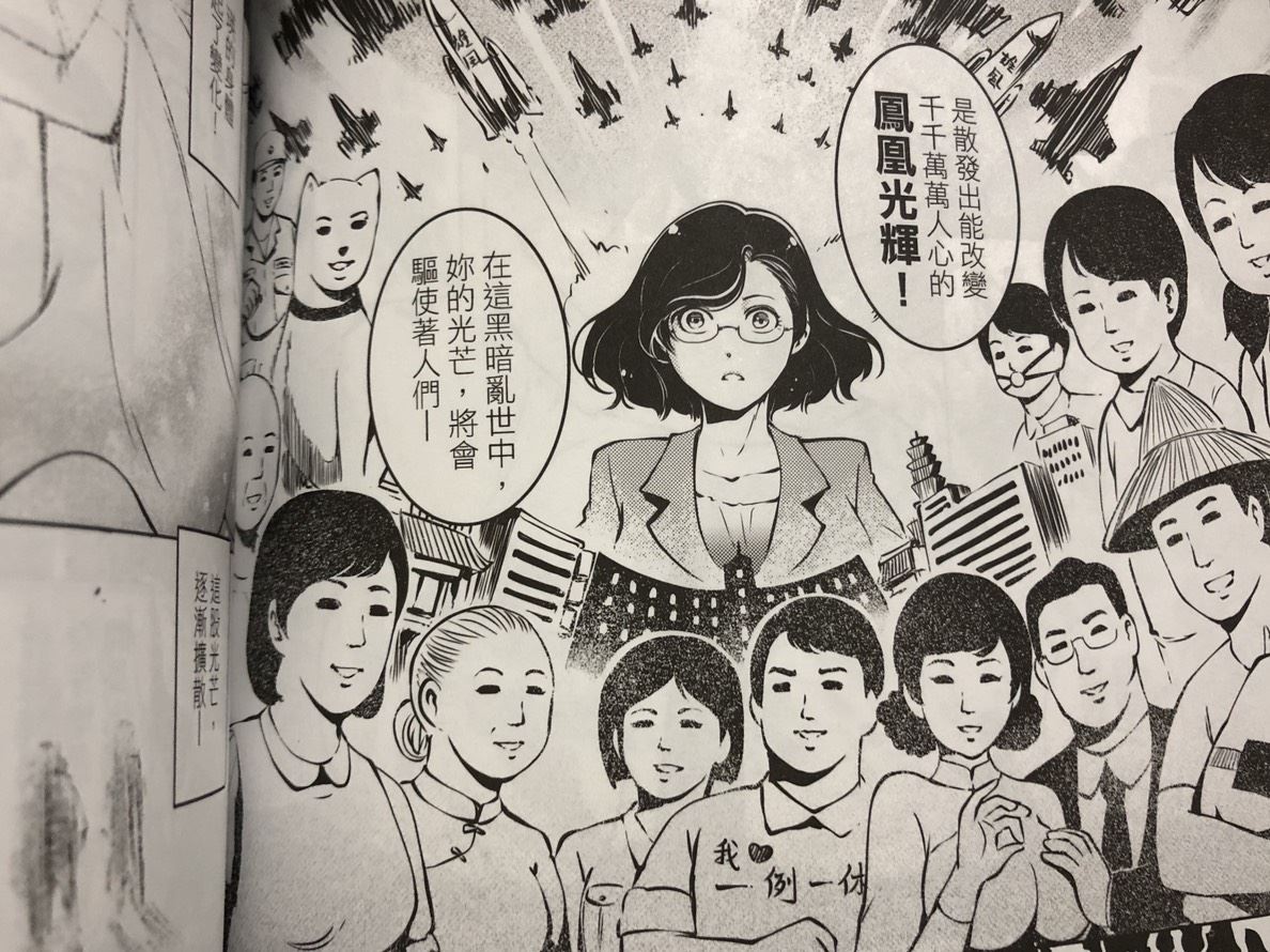 尤其瑛的大絕招「鳳凰光輝覺醒」,一旦被這些發光有能量的太陽花照到的人們,就會變成國語課本上經典的「小明臉」。「所謂的標準模樣,就是變成皇英自己想要的乖模樣」,韋宗成在那些看似正經八百的單格小框裡,畫著台灣政治人物的假想故事,插圖卻充滿諷刺意味的爭議事件:「一例一休」、「雄風飛彈(誤射事件)」還有總統府官邸的貓狗家人一併同框。