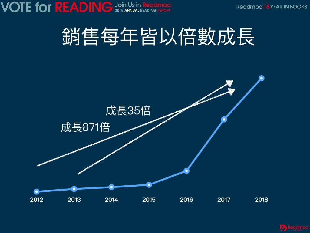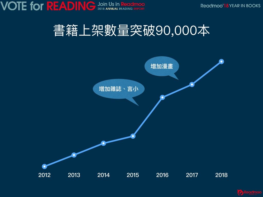 從2012年起,Readmoo一腳踏入台灣電子書市場,從最初「只有電子沒有書」的荒漠境地,到2018年年底,已有1700家出版社、90000本書與Readmoo平台合作上架。(註:2013年時,合作出版社僅260家,上架12000本書;2017年,合作出版社達800家,上架60000本書)2017年,他們更推出專為繁體中文閱讀而生的電子書閱讀器mooInk。於是,從電腦、平板、手機App到閱讀器,Readmoo的數位閱讀版圖自此完備。