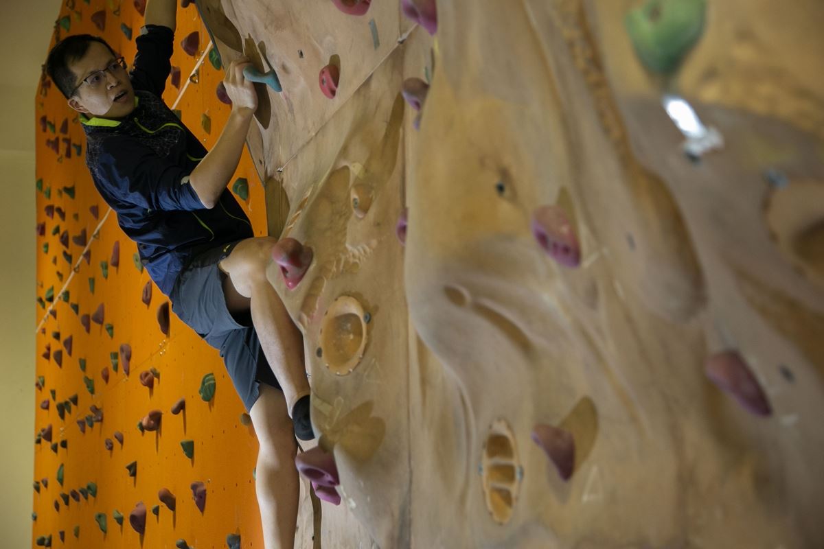 連明偉說,得先觸摸每個岩塊,感覺哪個支撐點較穩妥,衡量能否藉由岩塊支撐身體重量,衡量可以在岩塊上休息多久。「攀岩是永遠在運作中,得知道自己要休息多久,不是攀上去就沒事了,要先把接下來的路線想好。」