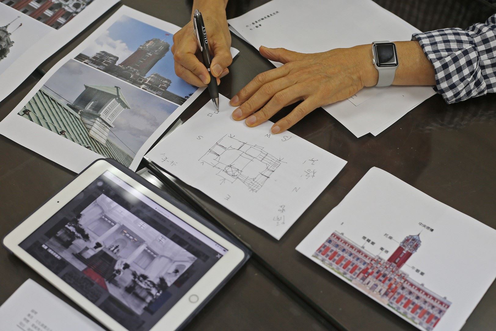 一談起研究近50年的總統府,薛琴不斷用雙手比劃、熱情十足。我遞上紙張請他繪圖講解,才不過幾秒鐘時間,他已經大致繪出總統府主體「日字形」樣貌及內部複雜的橫樑結構,準備暢談這棟百年建築的故事。