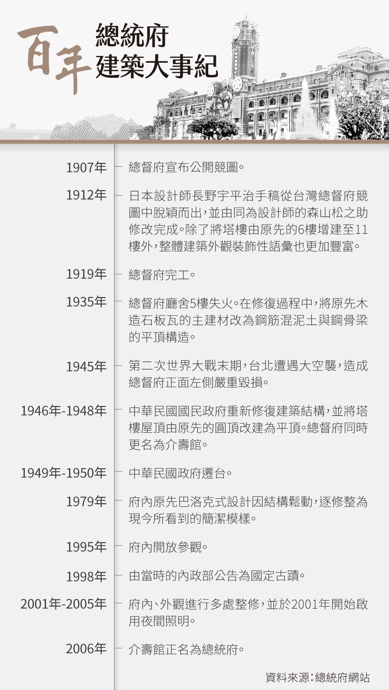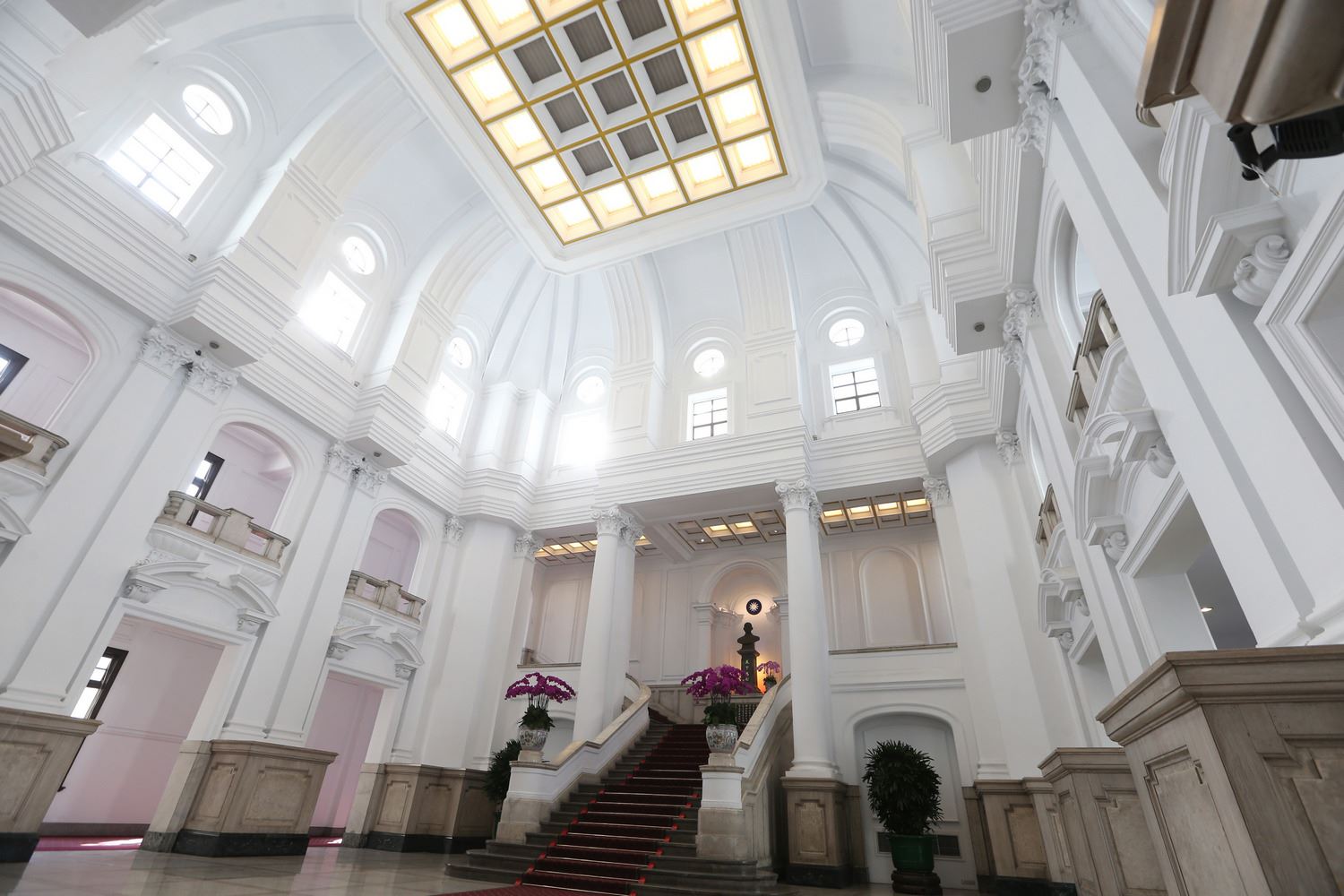 總統府100歲了,細看其外觀,傷殘粗劣之處不少,修補痕跡處處卻不見細節的修整,若拿著舊時照片比對,最重要的大門與大廳也早失去原有面貌。進一步細究,凌宗魁指出了幾大「看點」,一是戰後的整修後,正立面少了兩個小圓塔,車寄的圓弧山牆被修成水平簷帶,形成一陽台設置,「當時的蔣總統因此能站在『墨索里尼的陽台』上跟全國軍民同胞揮手致意。」