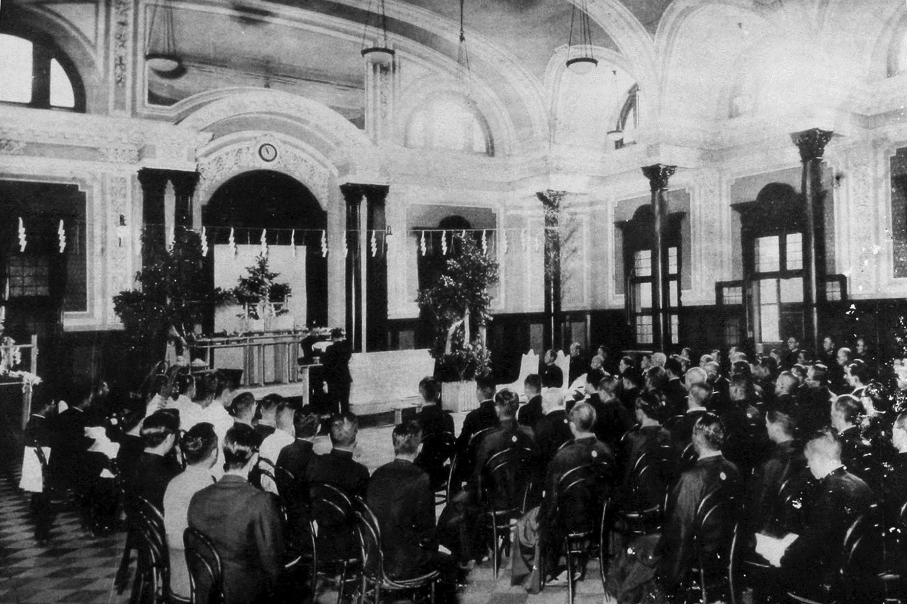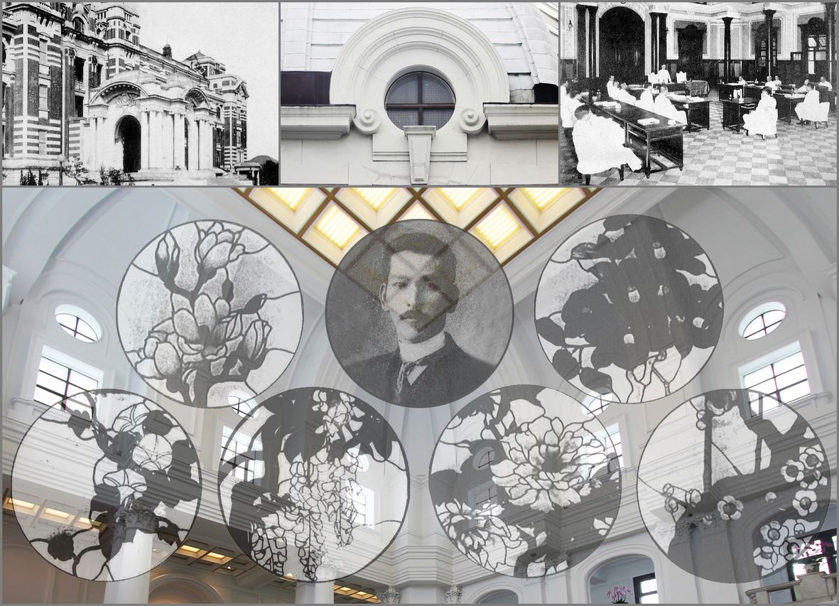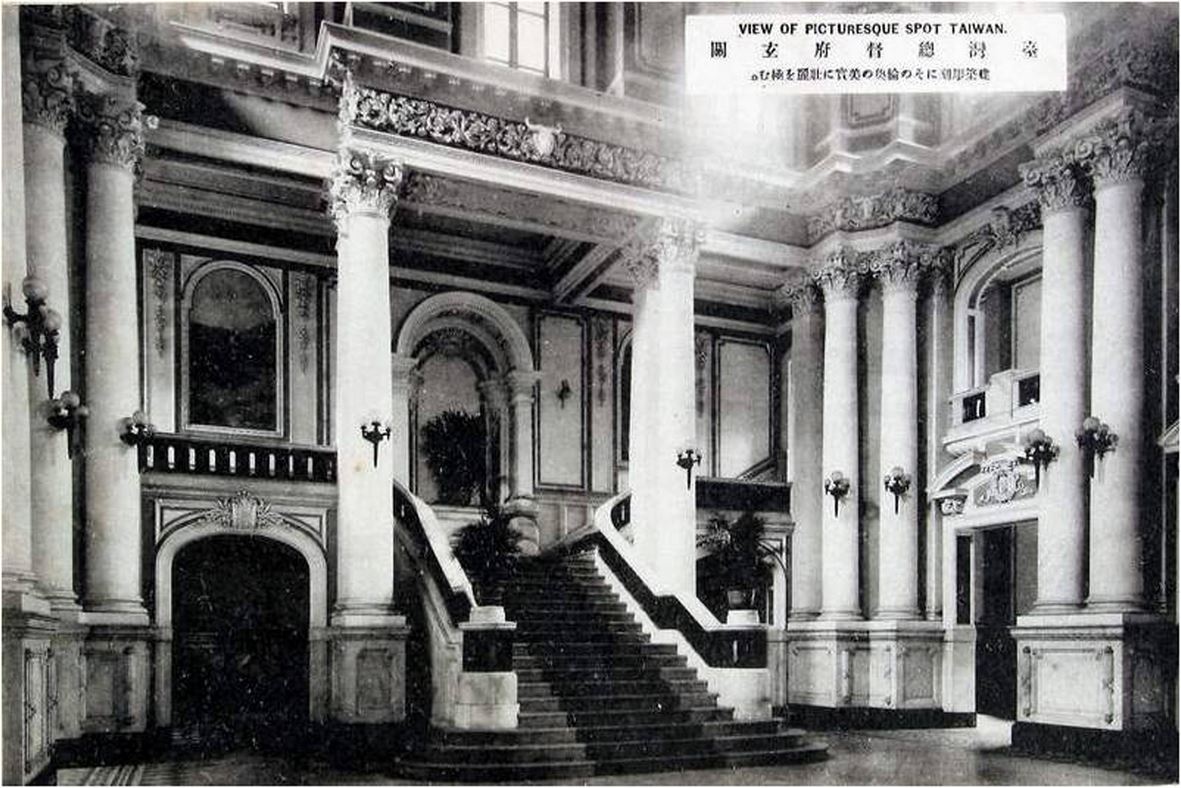 較少人談論的,還有總統和外賓合照的挑高大敞廳,上頭所有的牛眼型採光窗原本都是以美麗的彩繪鑲嵌玻璃構成,當時森山松之助邀了同學武田五一以山茶、梅花、牡丹、紫藤、木蘭、牽牛花等植物圖樣,進行新藝術風格(Art Nouveau)的設計彩繪鑲嵌玻璃裝飾,再由玻璃工藝家小川三知製作。如此「浪漫」的存在,在戰後因陋就簡的修復工事中自然未能復原,時至今日,大家所看見的仍是十字鋁窗與毛玻璃。