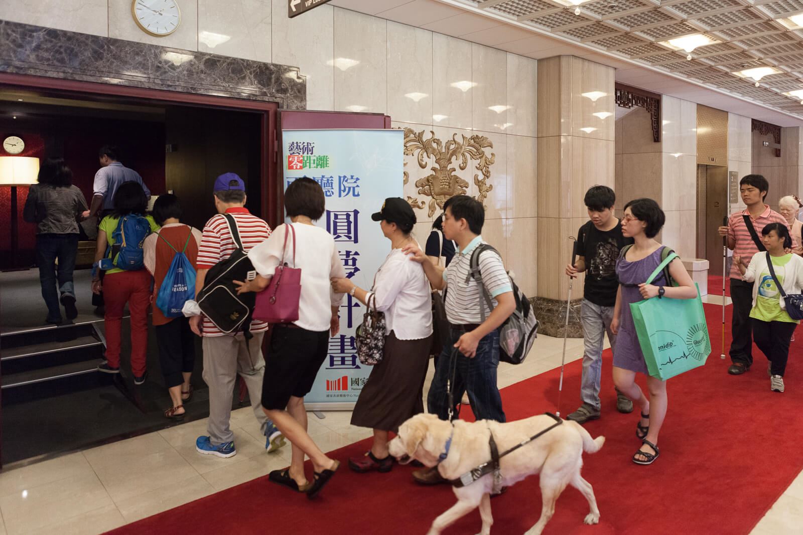 公共空間則建置適合嬰兒車及輪椅行進的無障礙坡道及電梯,無障礙洗手間、無障礙電動升降平台、自動感應門等設施,提供進入兩廳院的無障礙最佳動線諮詢與建議、服務臺聽覺無障礙迴圈系統等客製化服務,以及針對不同對象安排手語、口語導覽服務,讓導盲犬也可進戲院。