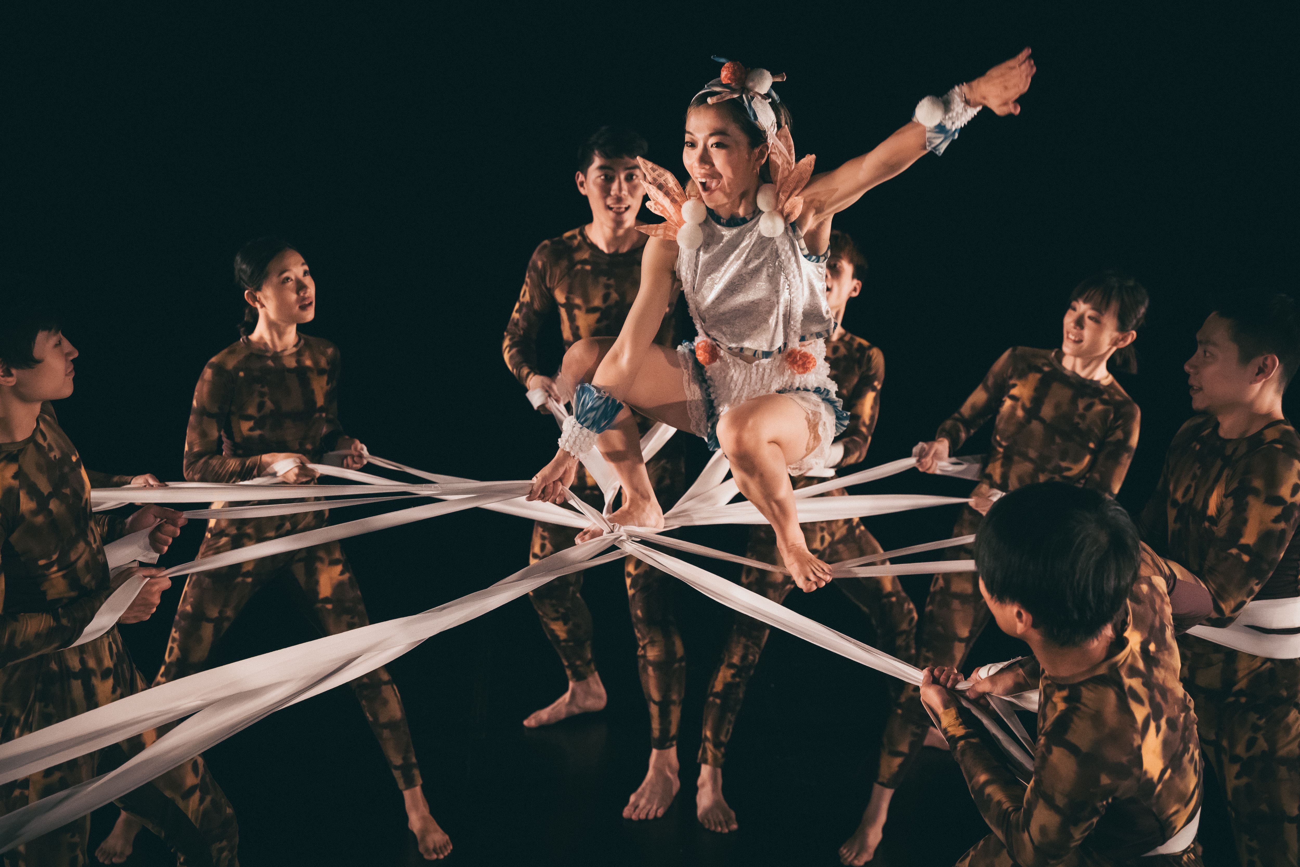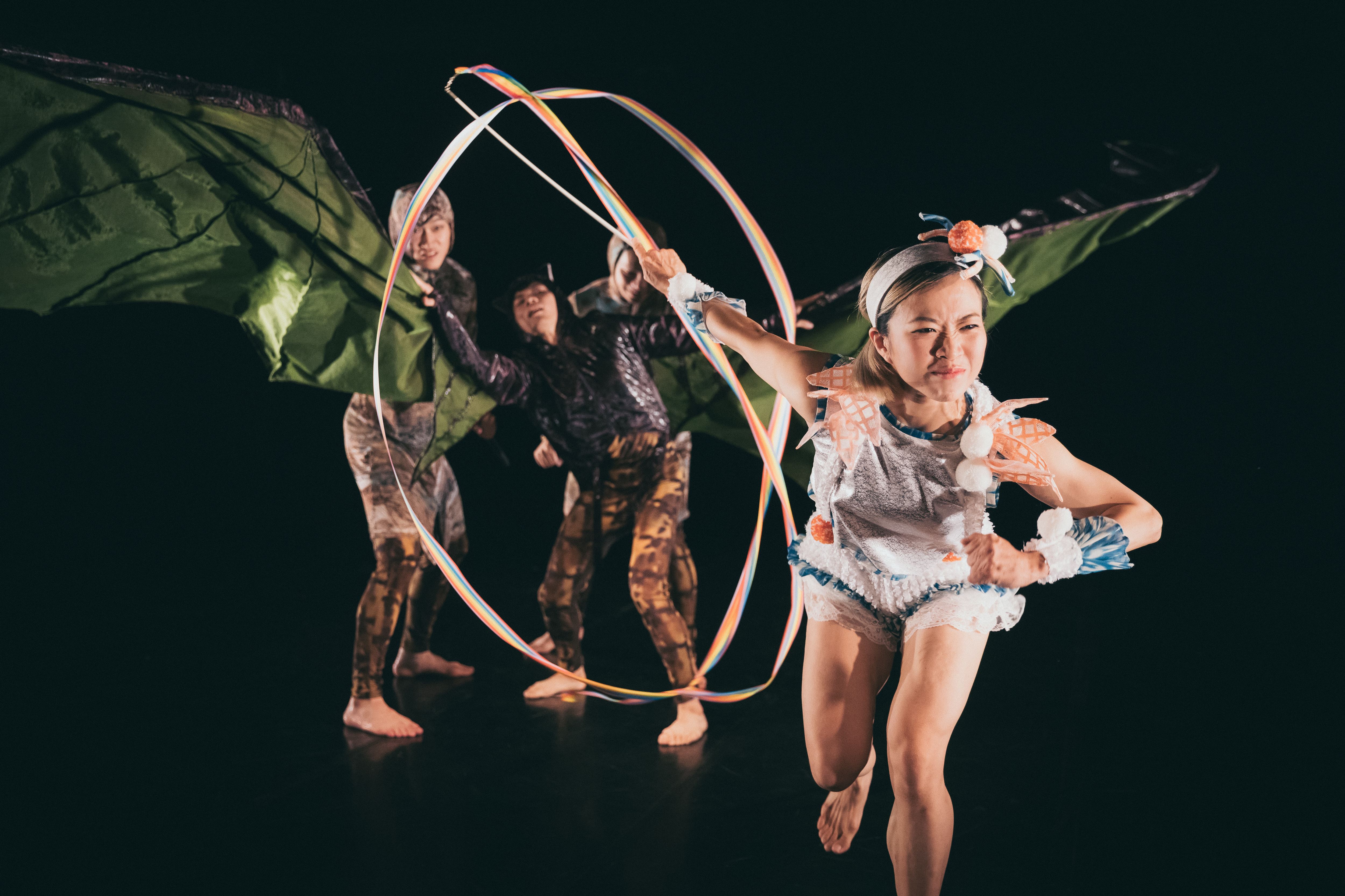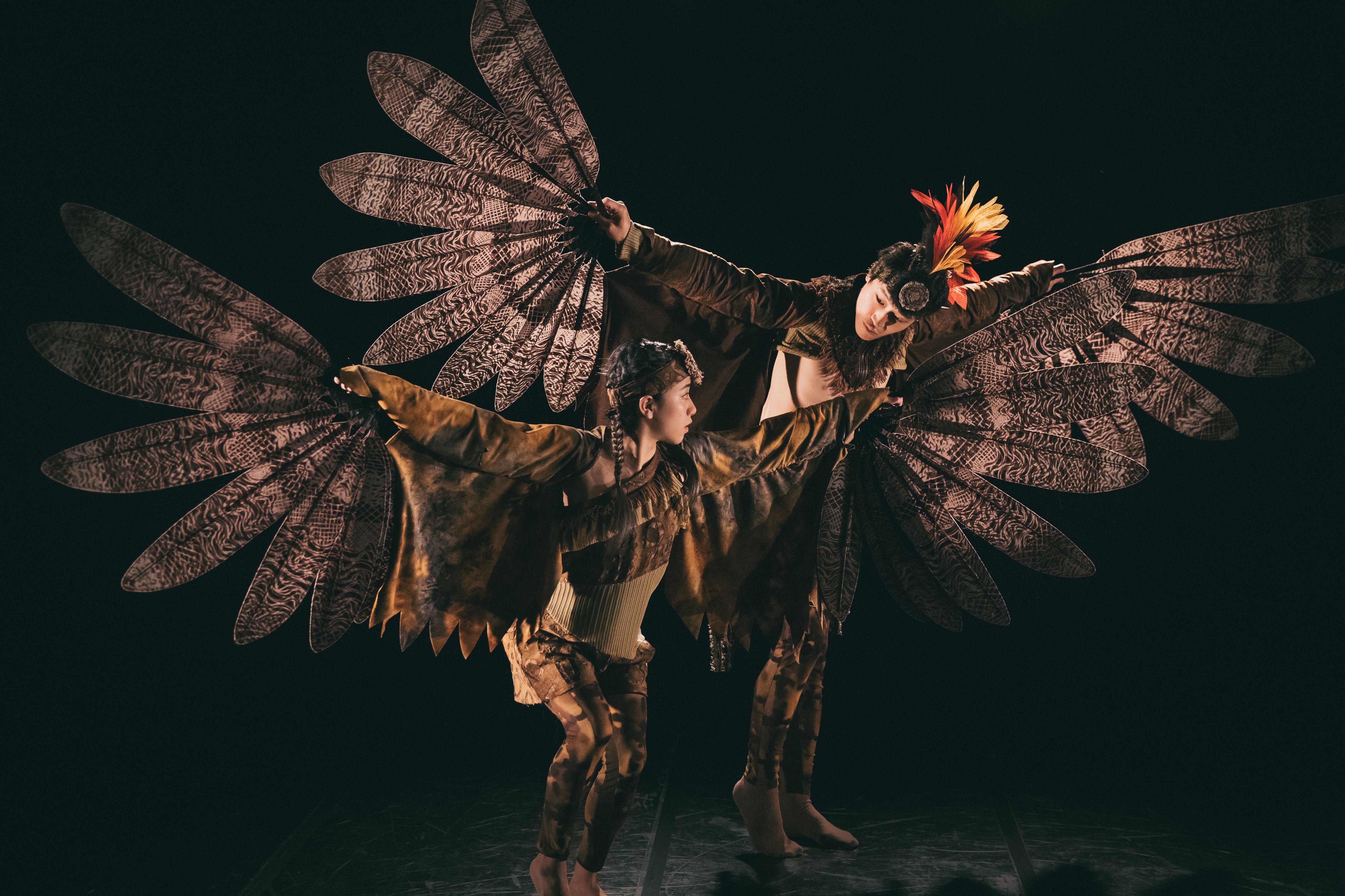 「燈光轉換,舞台漸漸亮起來,森林裡從黑夜轉成了白天。四位飾演黃山鵲的舞者在舞台上,他們踮著腳尖,又高又輕地跳躍,以芭蕾舞的群體舞,表現輕盈靈巧的黃山鵲。」