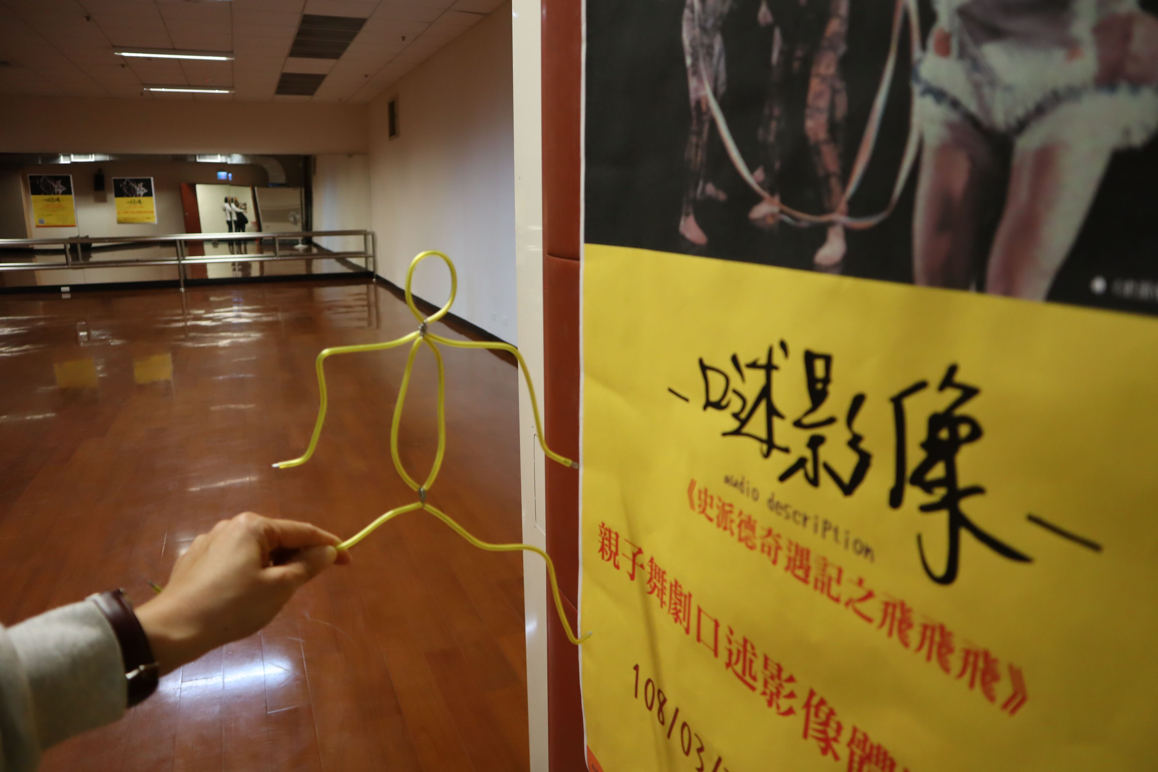 3月30日晚,舞蹈空間舞團在花蓮文化局演藝廳演出親子舞劇《史派德奇遇記之飛飛飛》,晚上7時30分的演出,有一群特別的觀眾卻提早一小時到場館,在工作人員的帶領下,這群觀眾身上戴有導覽器材,一隻耳朵上還掛了副耳機,他們把手搭在前方友人的肩膀上,一個接一個地走入場館熟悉環境。