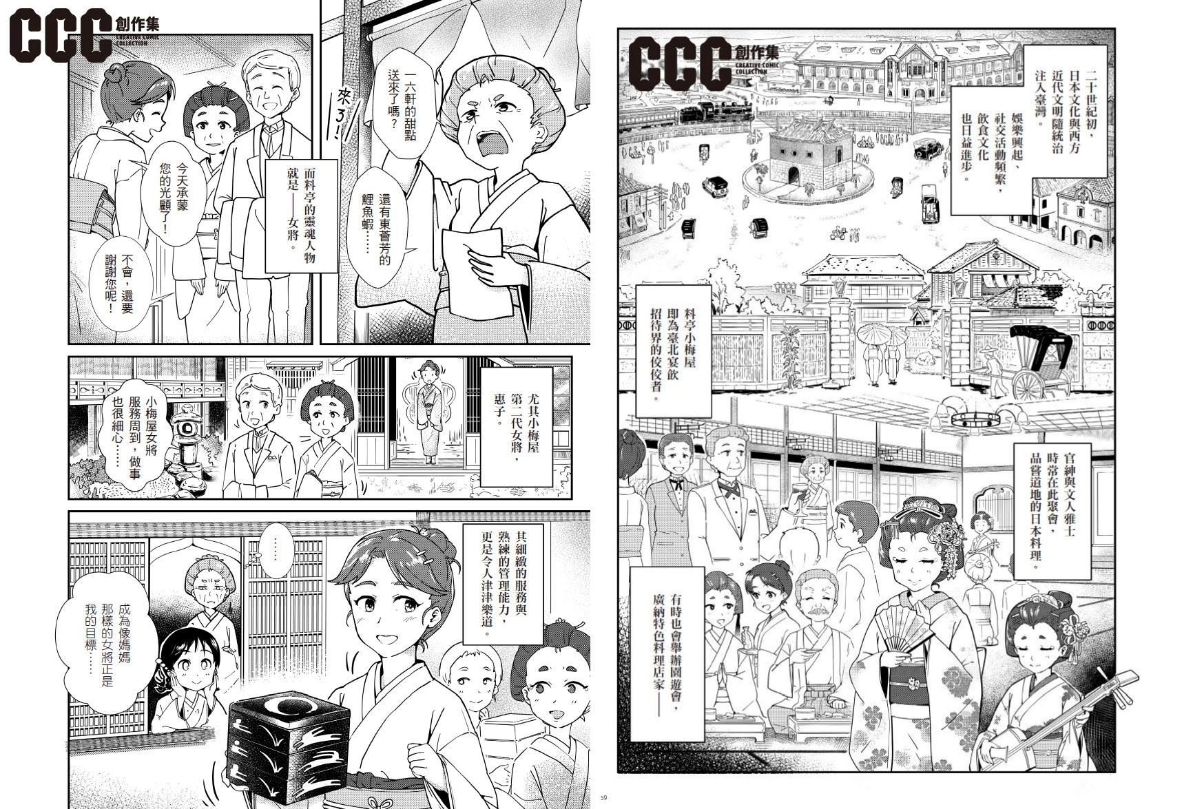 若要說最接近「美食漫畫」這個屬性的,目前正在CCC創作集上連載的《友繪的小梅屋記事本》,或許值得期待。這部漫畫將背景設定於日治大正時期的台北,日本女高校生友繪是料亭小梅屋的第三代,為了證明自己的能力,她接下園遊會飲食組的任務,負責與各店家接洽。