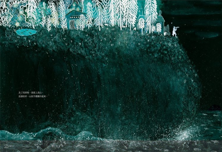 那彷彿湖泊的海域清澈無比,無論身處海中深處或海面上都可往上或往下凝望,於是那些水底幼鯨就像人類嬰孩一樣,一邊安安靜靜吸奶一邊東張西望,好像同時過著兩種不同人生,在吸取世間養分的同時,精神上仍受到前世某些記憶的滋潤,所以幼鯨似乎也是抬頭向我們看……