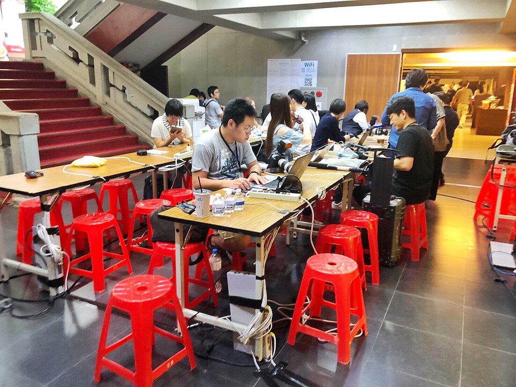 媒體中心也很有趣,位於後台的採訪區,記者們下午就到了。採訪區域空間很大,但來的人多,每人能分的工作區域也就小,大家摩肩擦踵地坐著,死盯著前台現場的即時影像,劈哩啪啦地破壞電腦鍵盤。記者們勤快,時常餓得緊,便當、自助餐、甚至還有宵夜,該餵飽的主辦單位盡量做到一個也不少。每個獎項一公布,得獎者在台上講完感言,後台就是聯訪,多半講些跟台前沒差別的話,哎呀,得獎情緒委實激動,甚至有人太過震驚,能談的本就有限,自是不便苛責。