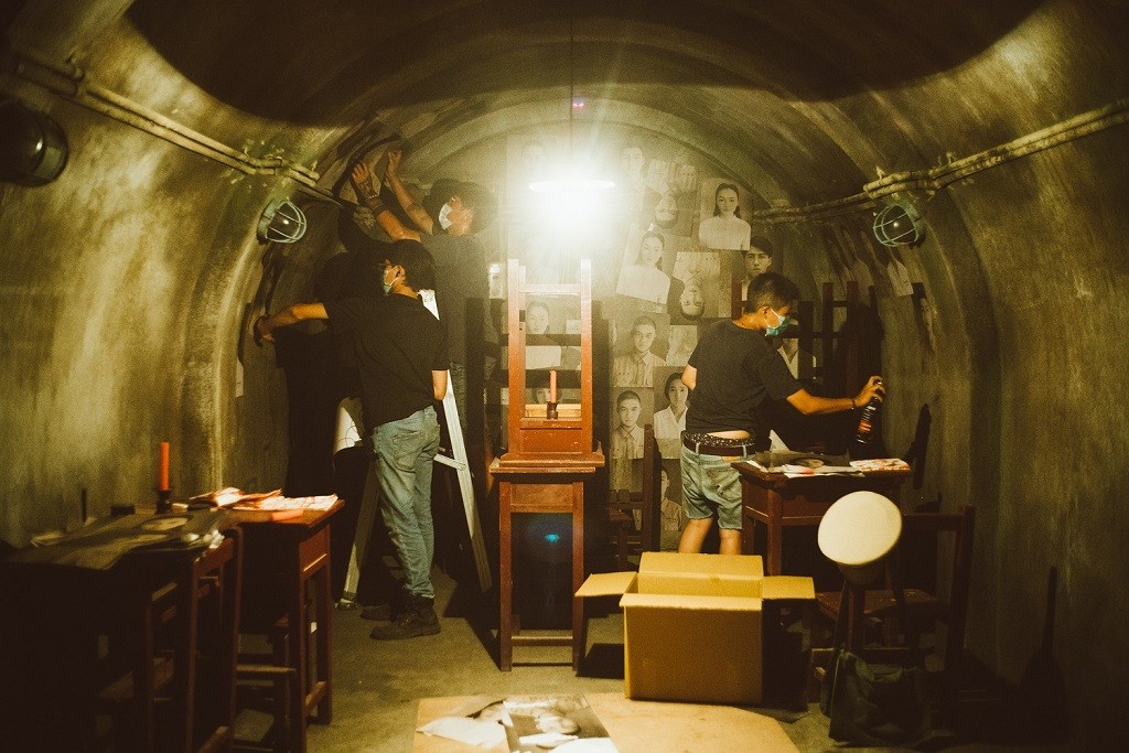 例如學校的防空洞,與掛滿「忌中」大布條的地下通道,其實是在台中菸葉廠拍攝。但徐漢強說,「其實拍攝現場那條通道盡頭是沒有建築物的,我們在通道盡頭另外做了一個假門,在建築物外面搭了一間防空洞,拼出整個場景。」