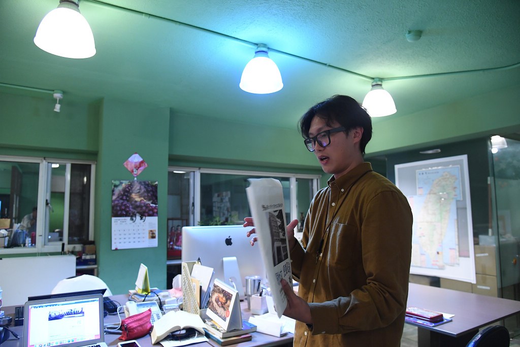 魏德聖的辦公室一頭,他們將北、中、南、東的地圖,拼成半面牆的台灣地圖,這是他與魏德聖討論勘景行程用的工作圖。地圖上處處都是標籤貼、螢光筆的記號。