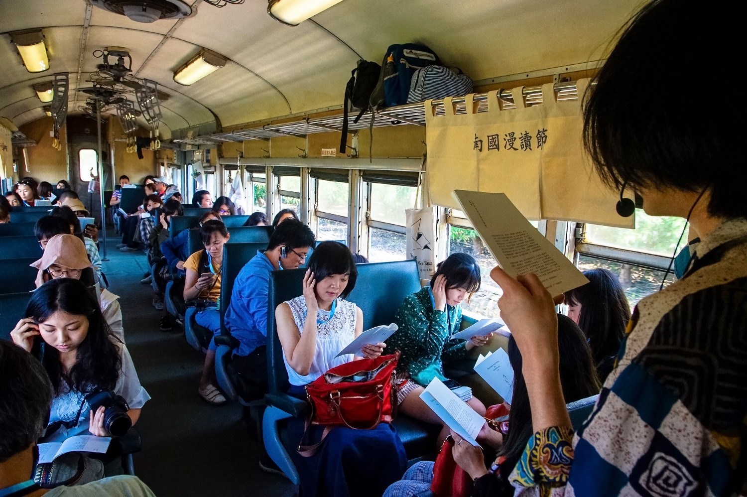 眾人魚貫上車,主辦單位申請加掛車廂的這節,特別地有「餘韻」,車廂裡擺著書、掛著「列車上的書店」、「南國漫讀節」的布旗,散發一種醚味般的文藝氣息。