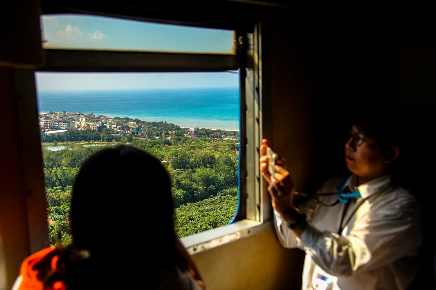 列車緩緩駛離枋寮不久,海就劃出一道光般出現眼前,惹得車廂裡盡是「哇」的讚歎。列車外左側是山、右側是海,光影橫疏與海景交替,車頭不時竄進一段闃黑的隧道。