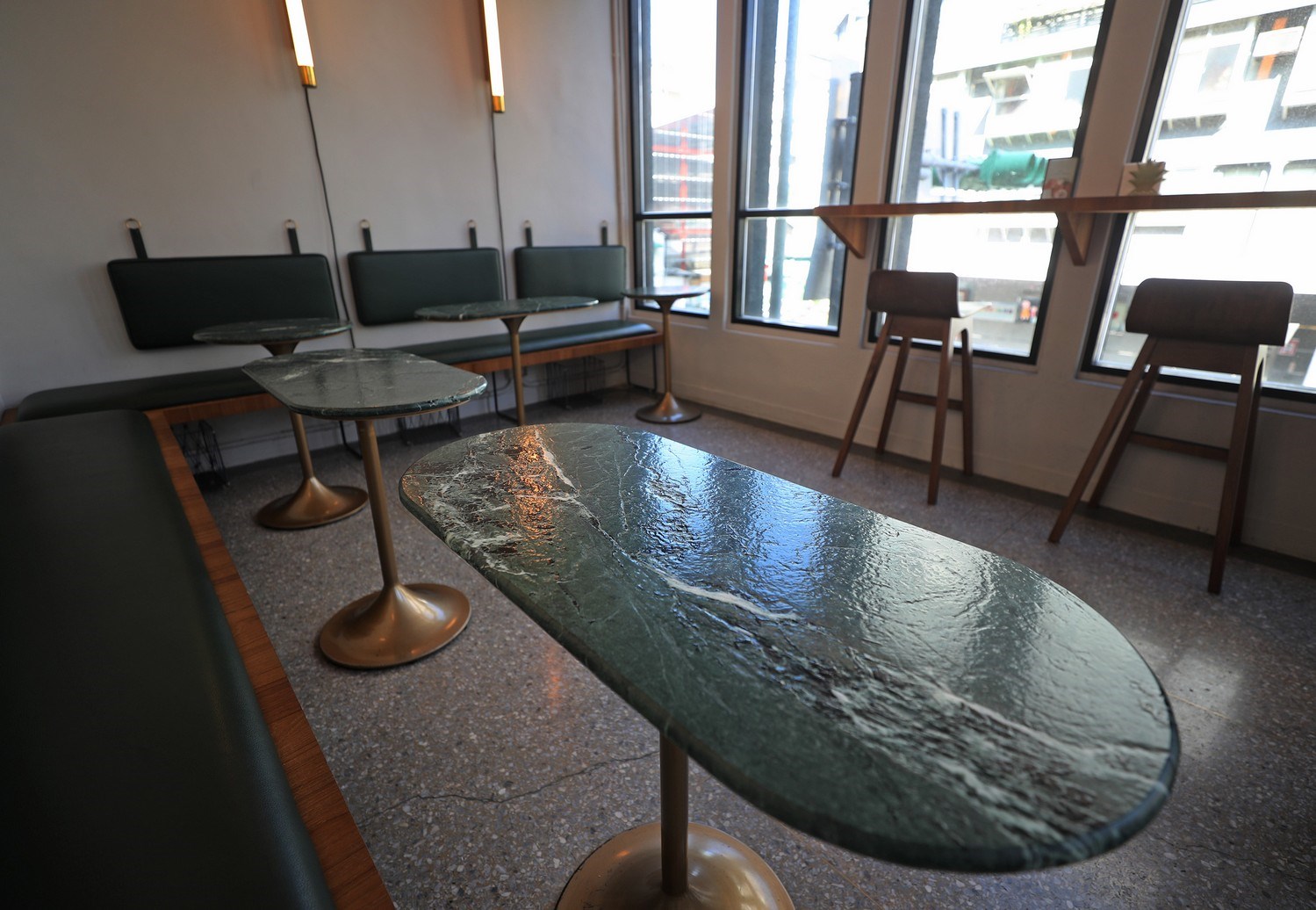 因為1、2樓目前為餐飲空間,所以室內設計以客席為主要規劃,潮州綠的元素也無所不在,桌椅、空間一樣加入了綠的元素。如2樓的吧檯面以及桌面,特別到花蓮石材場切了一整塊的蛇紋大理石做成,呼應綠色大理石紋的是整套的綠皮製座椅。陳啟健特別解釋,座椅是以過去火車的座位為設計概念,讓顧客2人並肩而坐,團隊認為,過往火車上雙人座位的那種親密感,是現代社會中很難看到的景觀。