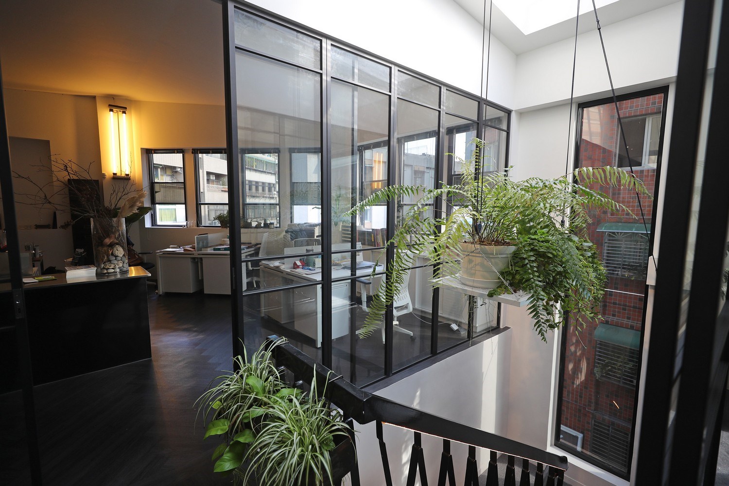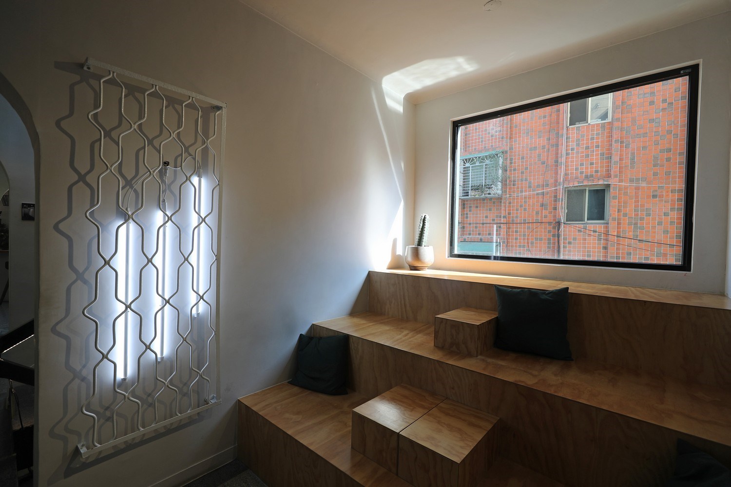 「貳房苑」因過去為警衛隊宿舍的關係,圍牆很高,因此窗戶也都做得很高,「雙好設計2 by Wu&Chen」團隊把1樓窗戶都改為大面的落地玻璃,圍牆也拆到在室內就能看到街景的高度,因為這樣的調整,自然光能夠毫無障礙的進入屋內。2樓最大的改造是廁所,陳啟健說,過去只有一間廁所,而且極為狹小,因此團隊將廁所打掉重新整建成兩間獨立廁間;3樓頂則以透明浪板為頂,在樓梯間形成了一天井,不論晴天陰雨,都不致過於陰暗。