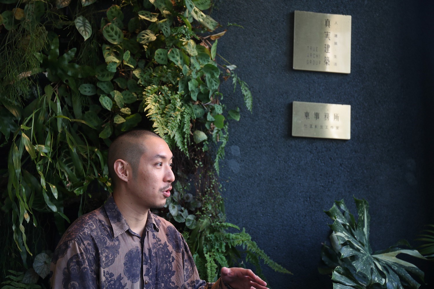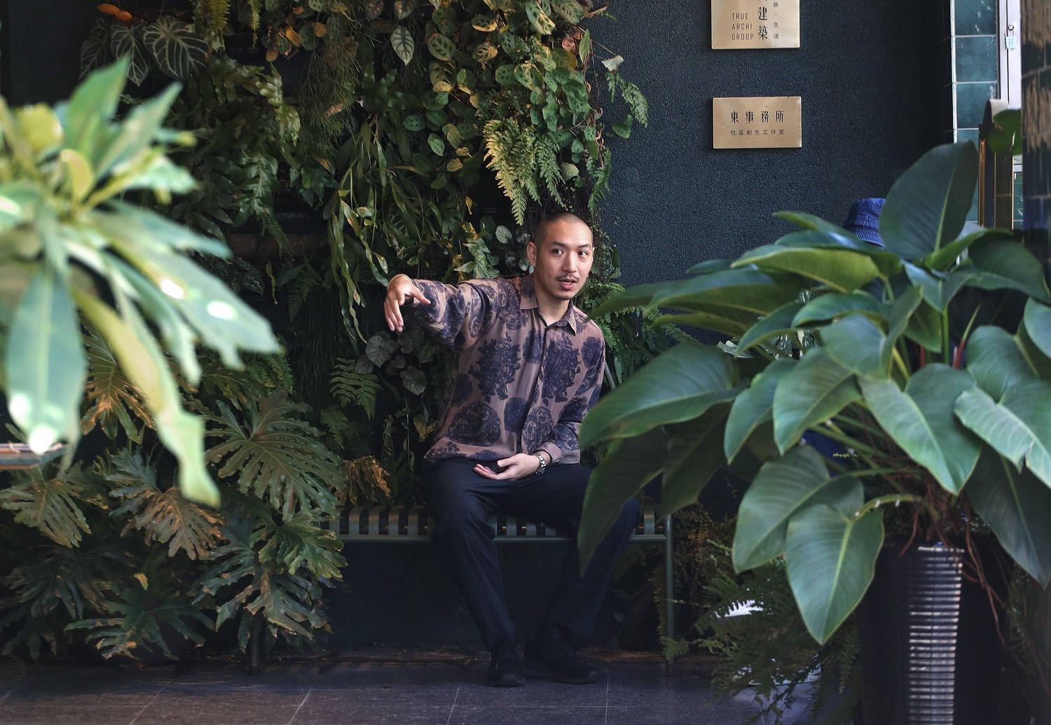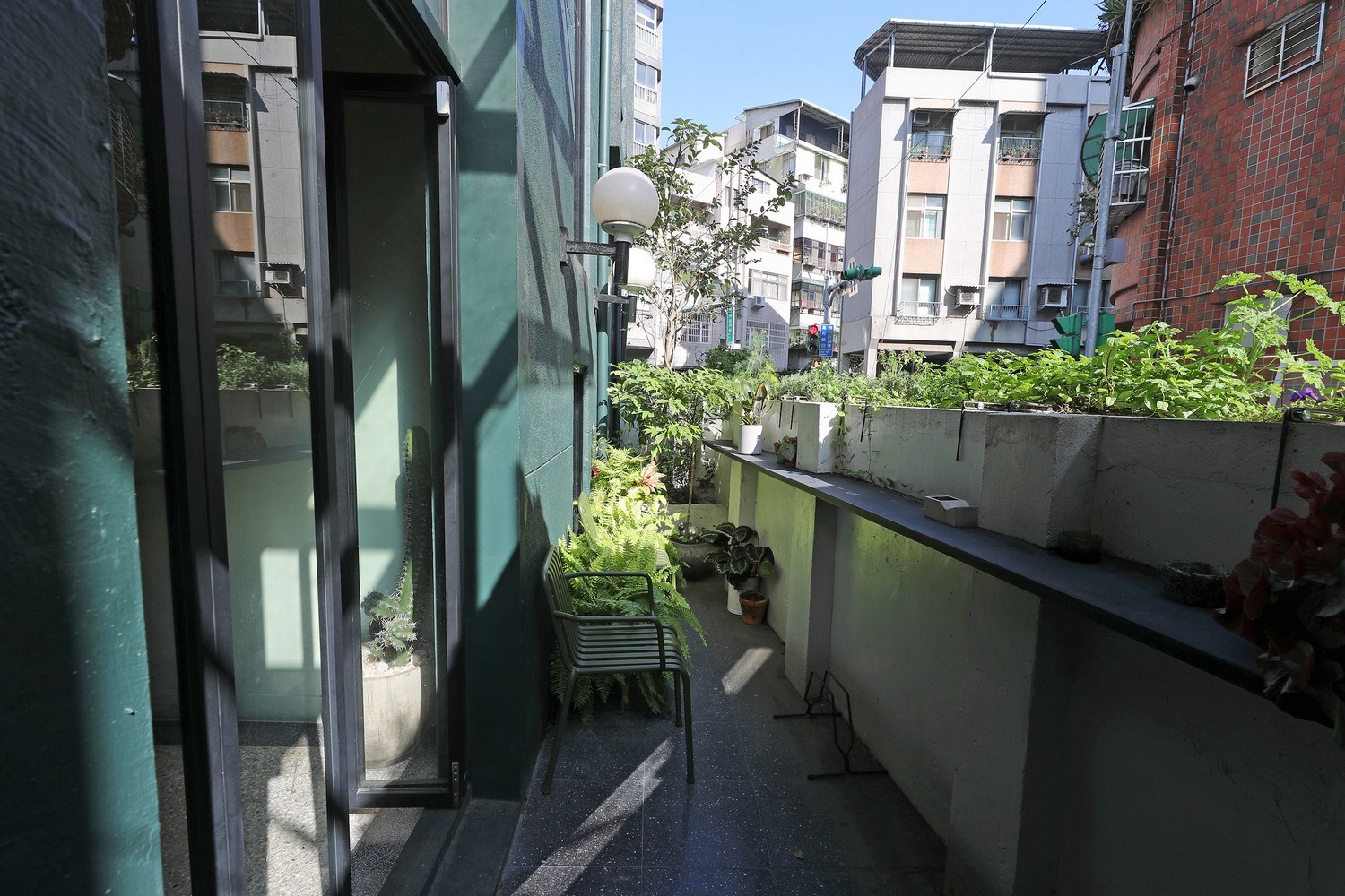 陳啟健指著對街房舍窗台上的植栽,滿溢出來翠綠襯托著大地色調的房屋外觀,他說因此團隊發現,綠是屬於潮州街的顏色,在設計「貳房苑」之初,綠色就成了最重要的設計語彙,「當時我們用綠色的時候,很多人說會不會像郵局或什麼之類的,但是其實最後的呈現,連施工的師傅都蠻訝異。」