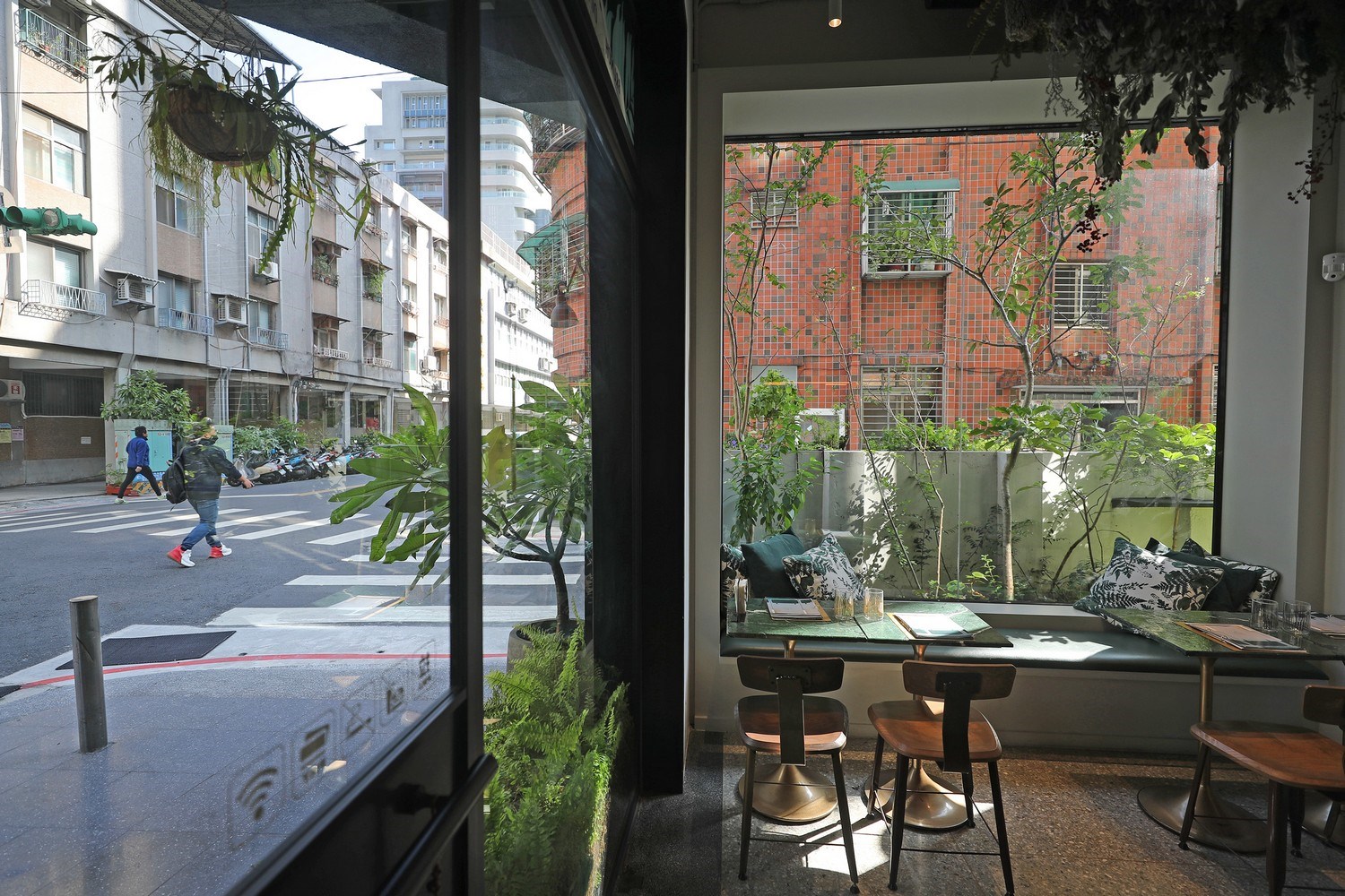 1樓的外牆上貼滿了「雙好設計2 by Wu&Chen」特別挑選的磁磚,那是Pantone色票上5463號,團隊給了這顏色一個名字,「潮州綠」,他們希望這個顏色能夠呼應潮州街本來的街道景觀,讓這條街道成為台北市中獨一無二的綠色。「坦白說綠色是個不好操作的顏色,但因為當時我們的店名叫作Living Green,老闆非常喜歡植物,所以用綠色也跟我們本來的店名有一些關係。」顏色對於設計公司而言,不是太大的問題,做設計得相信自己,有信心就做得成。