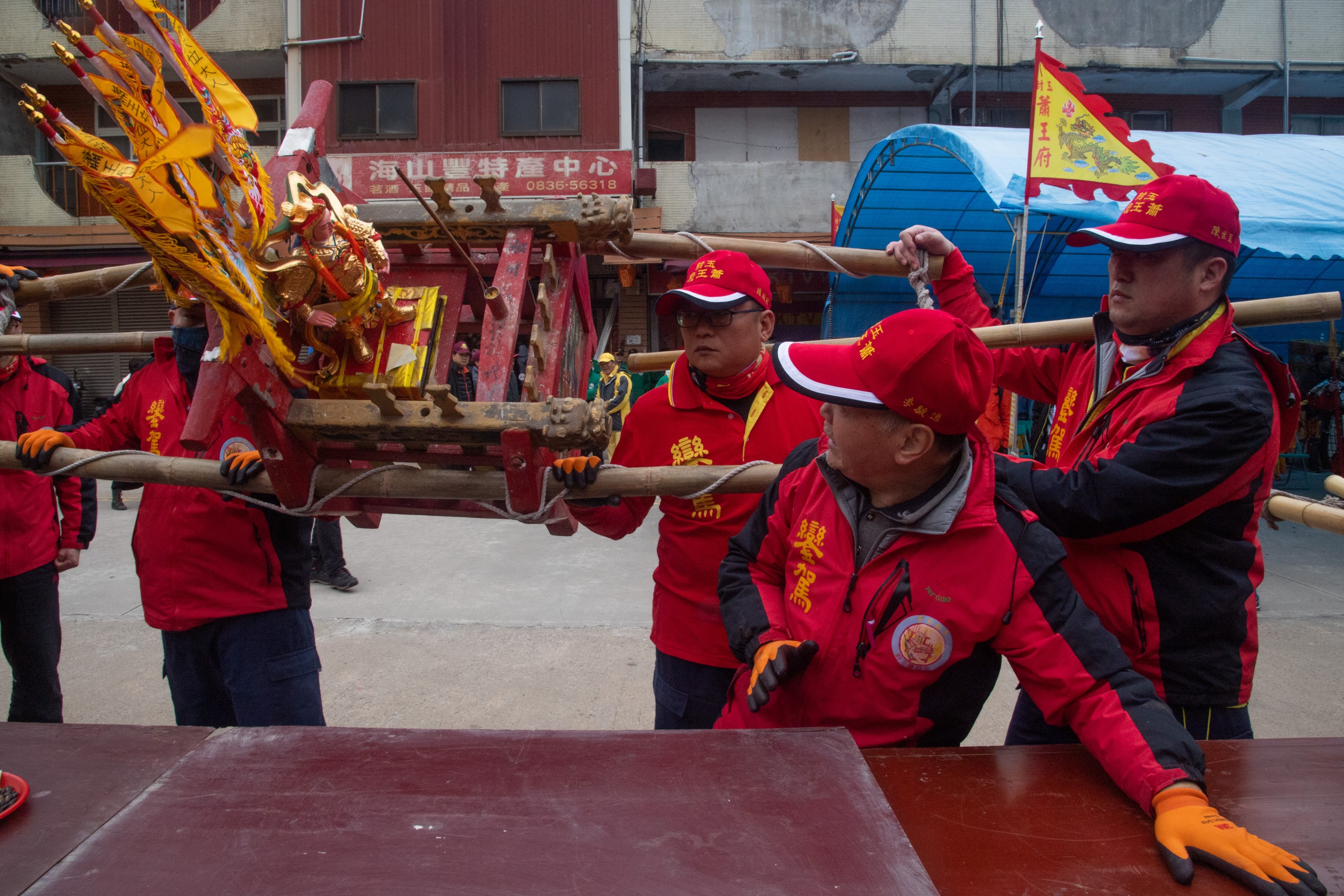 除了扛乩的乩將外,另有一人為「桌頭」,也就是神明的翻譯官,當神明透過乩轎右側在桌子上畫符寫字時,桌頭則負責傳達神明旨意。