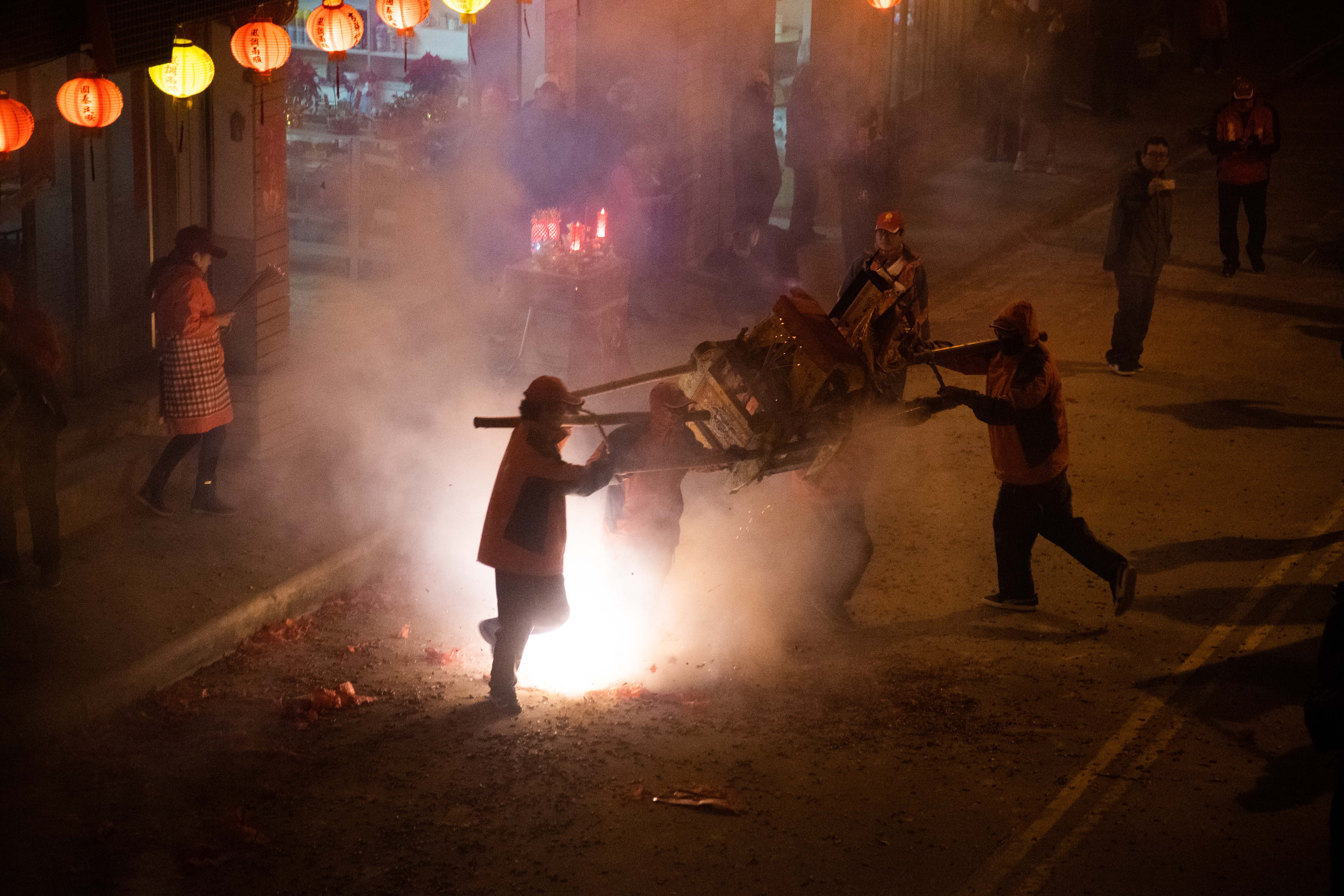 北竿連續好幾天的擺暝祭典,到了元宵節夜晚才是重頭戲,各家神明大會師,凡神明走過的家戶,鞭炮聲不絕於耳,有時不注意,身體還會被炸開的鞭炮噴到。