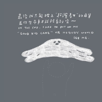 面對弟弟的自閉傾向、母親罹癌,相對「正常」的Pam Pam像個旁觀者——也只能旁觀,因為做得再多,也無法實際分擔他人的痛苦。在無能為力的痛苦與渴望被關注的拉扯之中,畫作中的主角選擇披上「超讚孝女床單」,做許多「乖事」:隨傳隨到、使命必達。