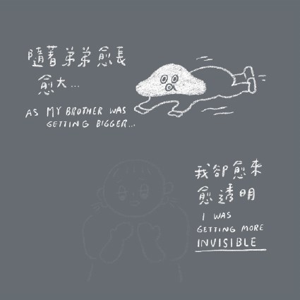 Pam Pam說,小時候弟弟有點自閉傾向,父母自然投注較多心力。某次看到週刊一則報導〈弟出生姊變隱形人 行為退化無聲抗議〉,喚起她同為「隱形人」的記憶,遂動筆畫下《我弟小時候》。