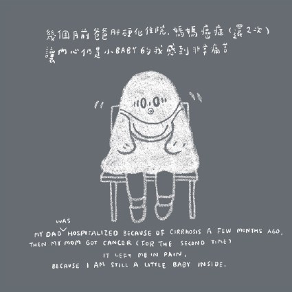 《我弟小時候》及《癌症好朋友》兩本紀實漫畫,是對於家人關係的重新梳理,也暫時釋放了長久鬱積,「畫畫會讓我忘記很多不開心,暫停去想過去和未來,不像活在當下,更類似一種麻痺。」