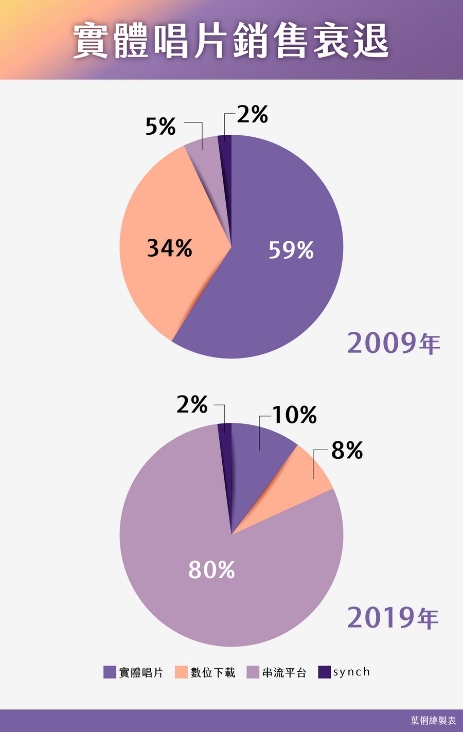 實體唱片銷售和串流音樂市場的消長,只要看以下兩張圖就可以一目瞭然。自2000年以降,台灣唱片銷量排行榜首,15年來由2000年陶喆的42.5萬一路掉到2014年五月天的10萬。至於國內音樂市場銷售占比,2009年實體唱片仍以59%大勝串流音樂的5%,物換星移,10年後的2019年,數字已完全反轉,串流音樂高達80%,實體唱片僅剩8%。