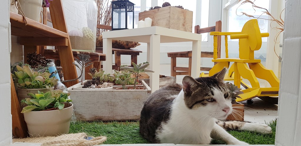 忽然一隻虎斑貓緩緩地走到身旁,像個小主人一樣引領我們穿過前院的草地、植栽,迎來木門後方的書店大主人林彥廷和郭德慧。女主人郭德慧對著虎斑貓,溫柔地介紹牠是紅氣球書屋店長「迪索」,職務內容包括「禮賓接待、店內環境維護、平息店貓鬥毆」。另外還有2隻店貓,「黑貓哈娜是迪索帶回來吃飯的女朋友,花貓小東在店門口昏倒,用苦肉計讓我們收養牠,現在是店裡的小霸王。」