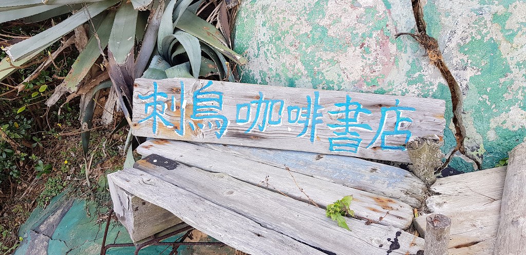 儘管沿途雜草叢生,納悶這樣的路真能通往書店?但還是隨著引路人的身影持續往前,走到兩側樹林再也擋不了風,直到一座迷彩建築映入眼前,一旁用廢棄木頭寫著「刺鳥咖啡書店」,這才確認了它的身分。