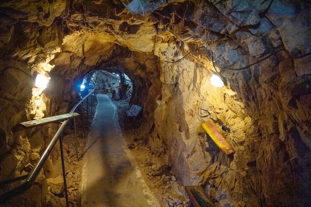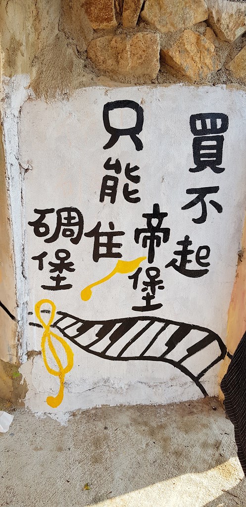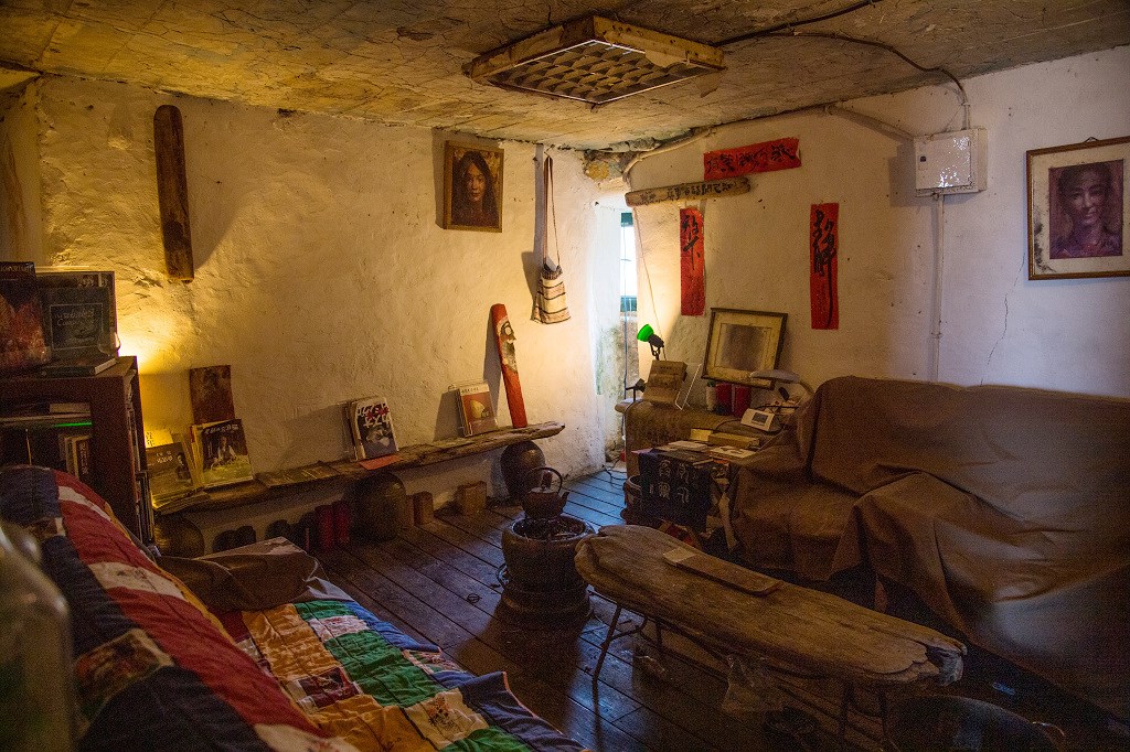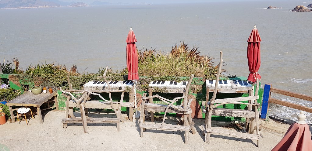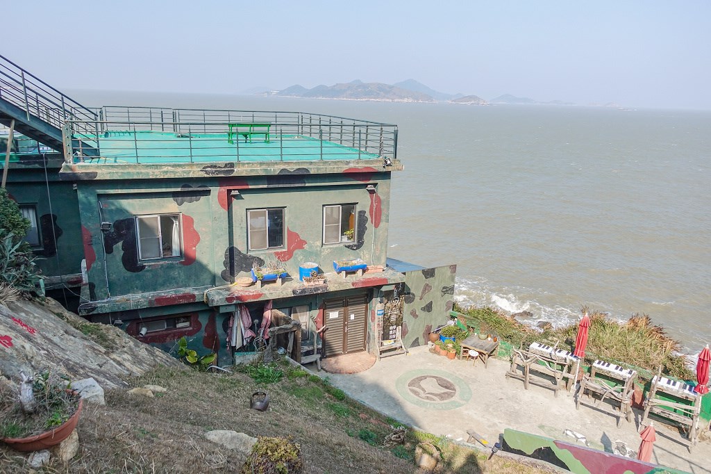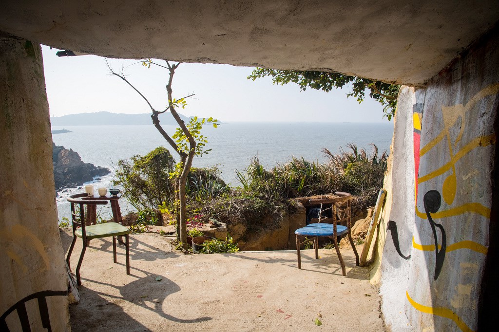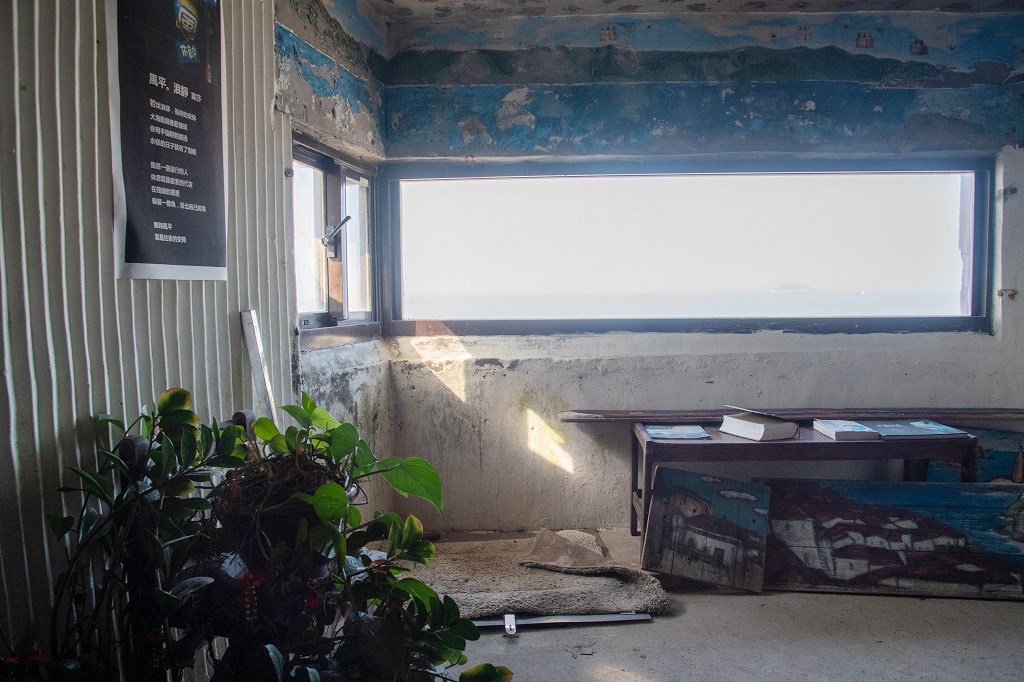 在一樓咖啡廳下方還隱藏著一座小型坑道,我們壓低身子順路前行。曹以雄說,「坑道象徵戰爭,走進坑道時身體要彎曲,代表要向歷史學習。」穿過了潮濕涼爽的坑道,通往昔日安放七五山砲和五零機槍的碉堡和射口,曹以雄把山砲、機槍移開,射口用透明玻璃密封,兩側擺了幾張桌椅,旅人隱匿在密不透風的空間,安靜聆聽窗外的海浪與自己的呼吸,海景盡收眼底,不遠的北竿列島就在前方,海面燕鷗飛翔,波光船影,美景如畫。對照一旁牆上留有過往射擊任務等標語,彷彿走進時空隧道。