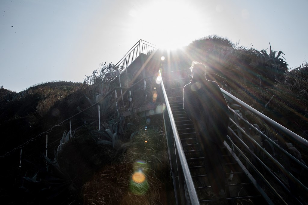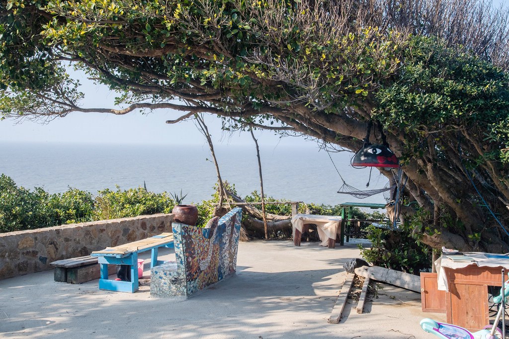 通往刺鳥咖啡書店的道路,是一條狹長且不斷向下的斜坡。若不是在地人指引,外地客只憑「南竿鄉復興村222號」的店址,可能不知道要先穿越牛角聚落的坡與巷後,看到「12據點入口」的招牌,還要繼續沿著草與樹間開出的道路往下走。