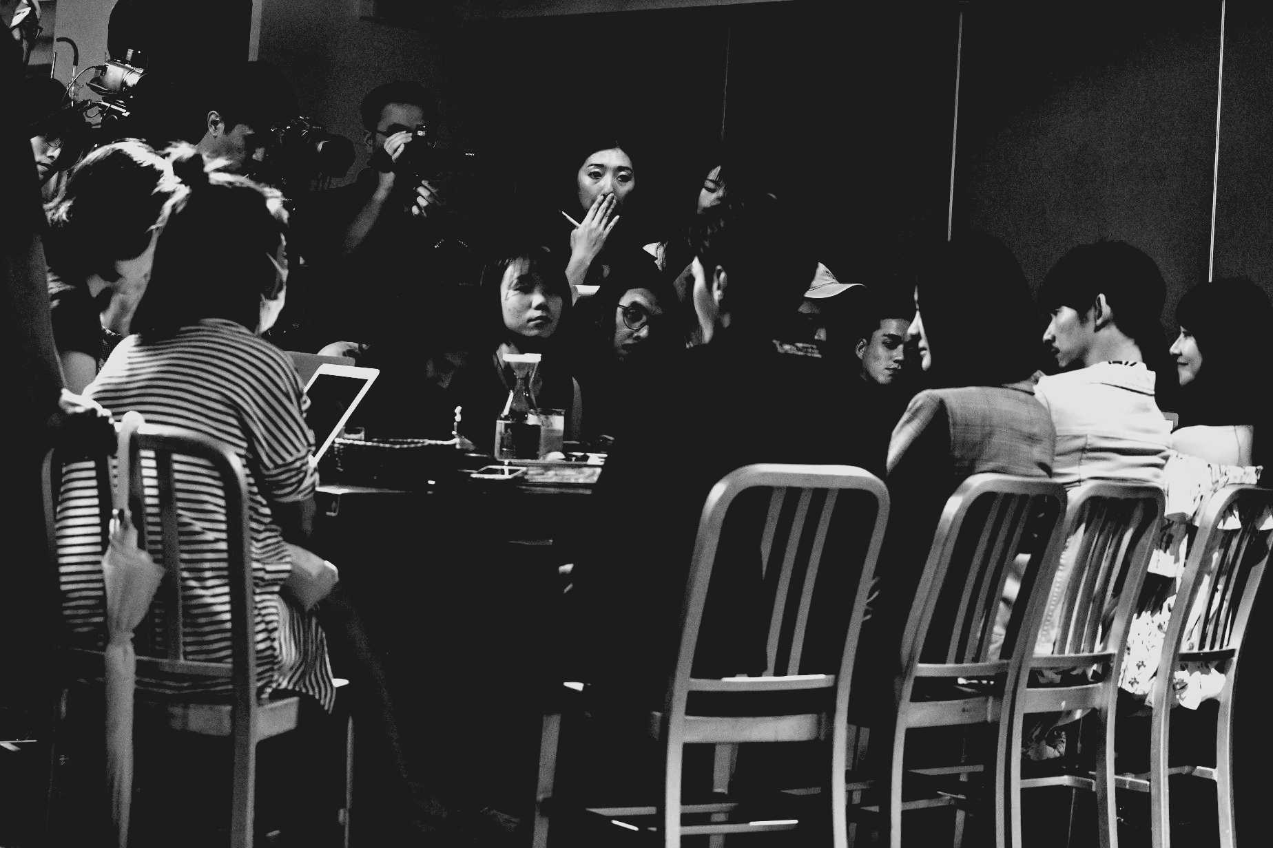桌子坐滿了人,所有的人都向前專注地盯著他。這個藝人是記者會主角,講得滔滔不絕,看得出來早就熟練於這類場合。記者們圍著他坐了一圈,手指飛舞,鍵盤喀拉喀拉響著。談的都是他自己──新作品、接下來的計畫、否認最近的緋聞,令人覺得有點乏味,雖然我的手也喀拉喀拉。