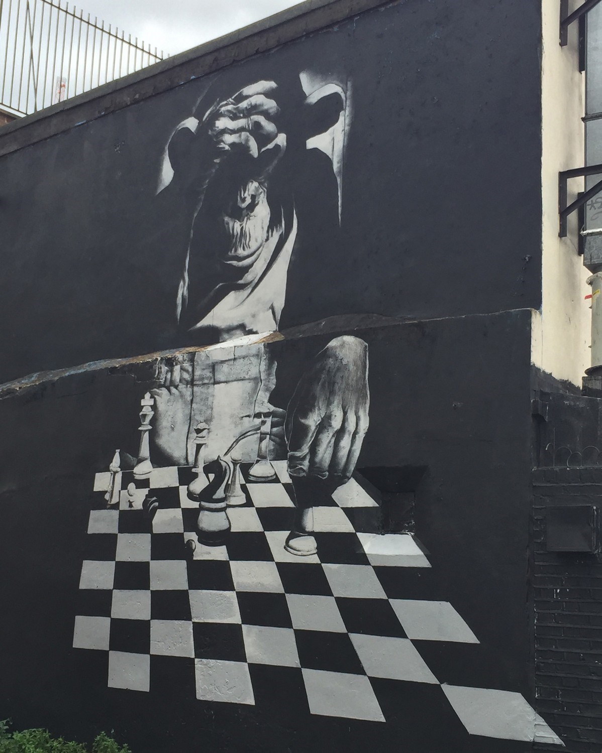 另有一幅作品利用3層樓建築作為畫布,畫著一隻黑猩猩對著西洋棋盤苦思。