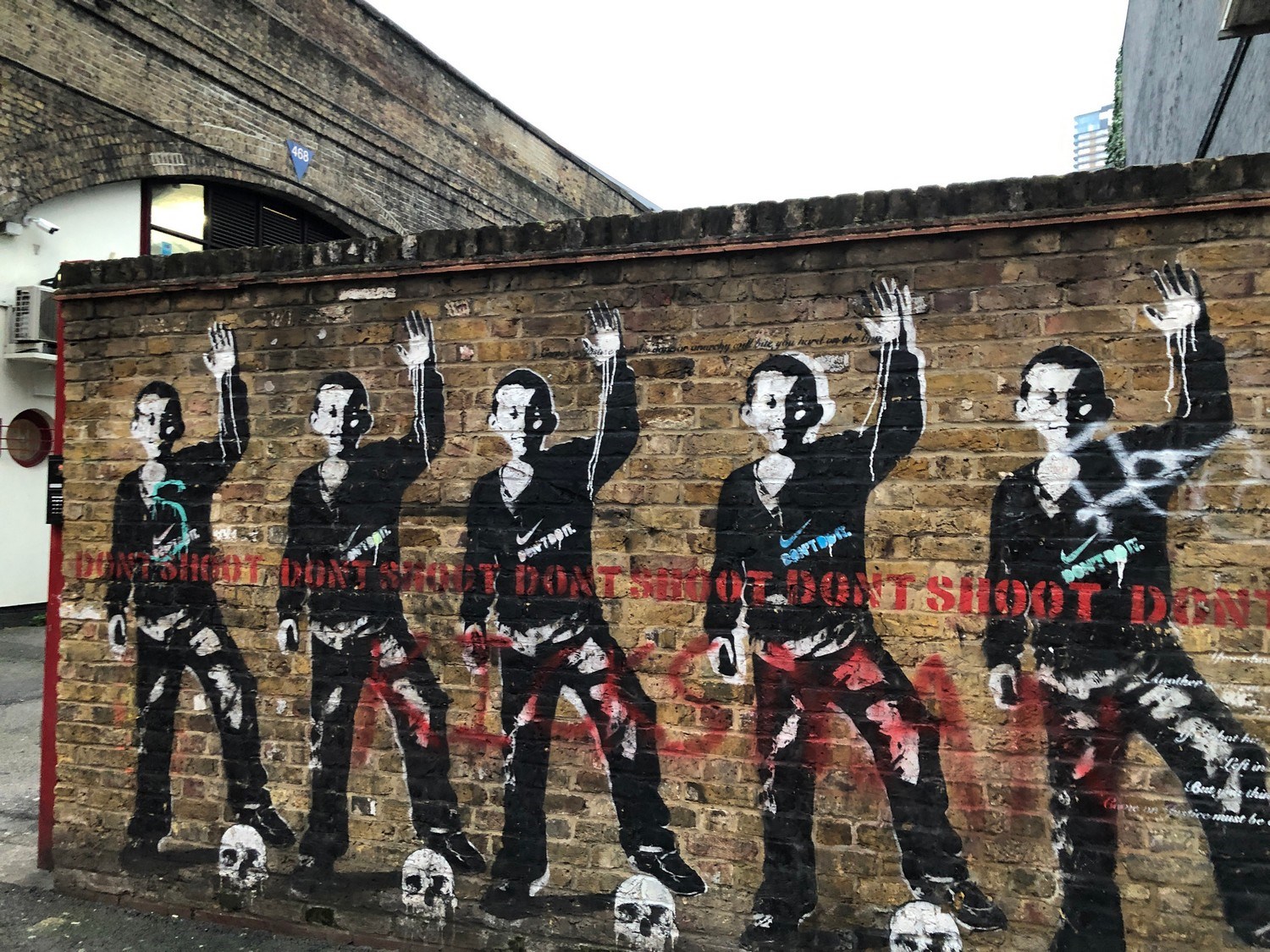 也有些作品具有社會意涵,反映時事。塗鴉藝術家Bambi在肖爾迪奇一片牆上繪製作品「不要開槍」(Don’t Shoot),紀念2014年發生在美國的布朗(Michael Brown)命案。18歲、沒有犯罪紀錄的非裔美國青年布朗在未攜帶武器的情況下,遭到白人警察威爾森(Darren Wilson)射殺。