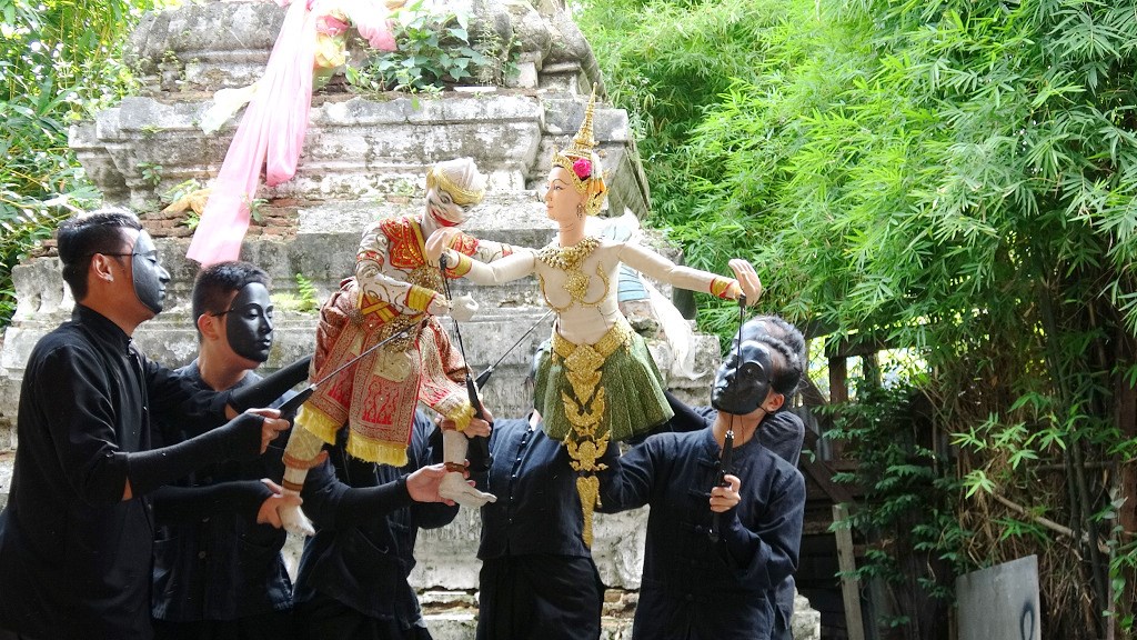 時間一到,正戲登場,穿著傳統泰式服裝的表演者首先登台,細緻華麗的手工服裝看得出泰式美學工藝,接著登場的是泰國神話中著名的猴神哈努曼(Haruman)和他的愛人美人魚(Suphannamacha)。操偶師三人一組,把哈努曼和美人魚舞得栩栩如生,觀眾幾乎忘了身穿深色服裝的操偶師存在。
