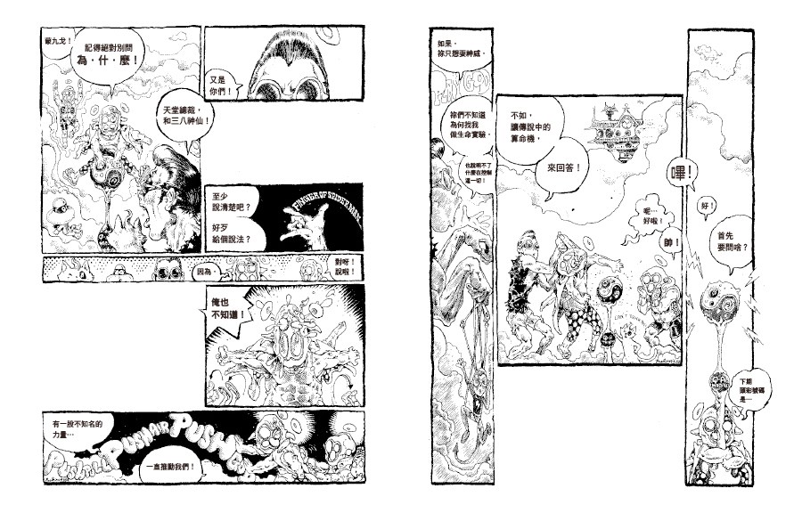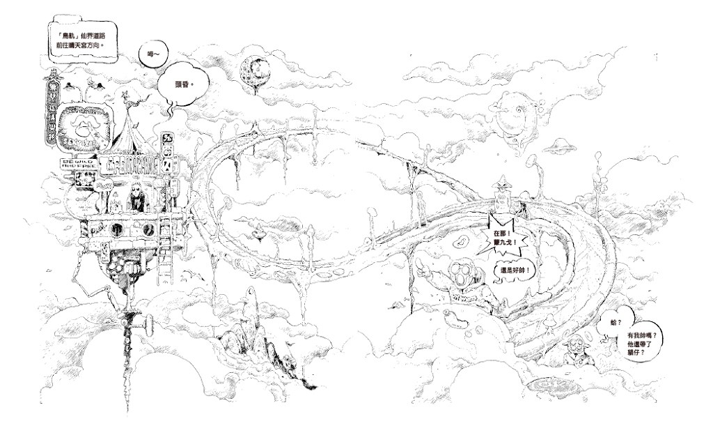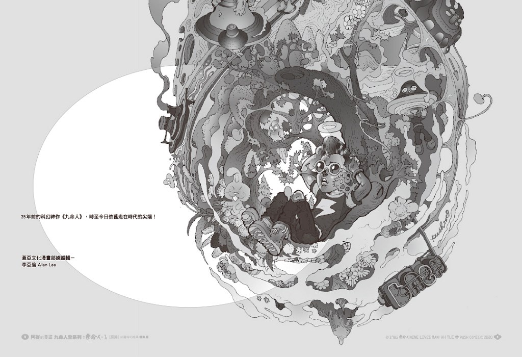 譬如《九命人》,以科幻的面貌重新解釋轉世輪迴、神魔對抗等常見的概念。一世一世變化之間,想像力的油門一路重踩,不曾停止,繁複的構圖也呈現出物質和疏離的時代氣氛。與其說阿推在發表漫畫,更像是他以造物主的身分,試著向世人揭露他打造的科幻世界,帶領人們離開地球表面,前往異星球。《九命人》也因此成為台漫重要的經典。