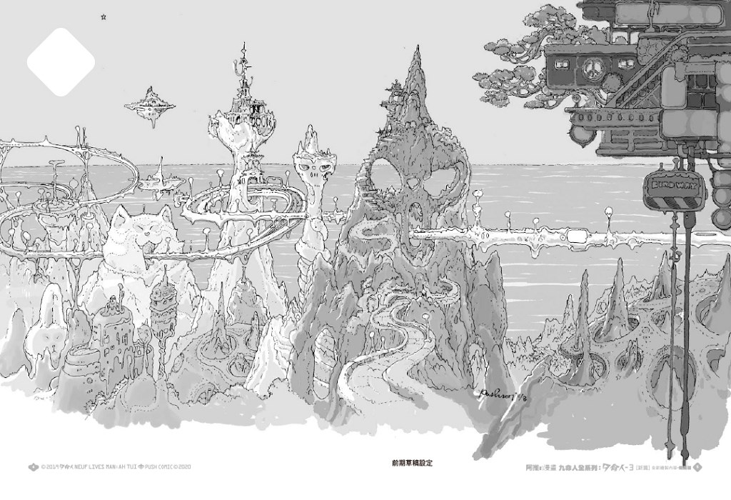 很幸運地,我們等到了蓋亞版的《九命人》復刻(2020),這次出版最受矚目的是,除了前兩集外,阿推還繪製了全新的第三集。這本新作對台灣讀者的重要性,不只在於可以重溫熟悉的阿推,事實上無論《野星球》、新竹縣政府出版的《風竹城》(2016),乃至「捉迷藏」展覽的主視覺,都可以明顯看出阿推的轉變,而《九命人-3》是少數能完整一窺這個新世界的機會。