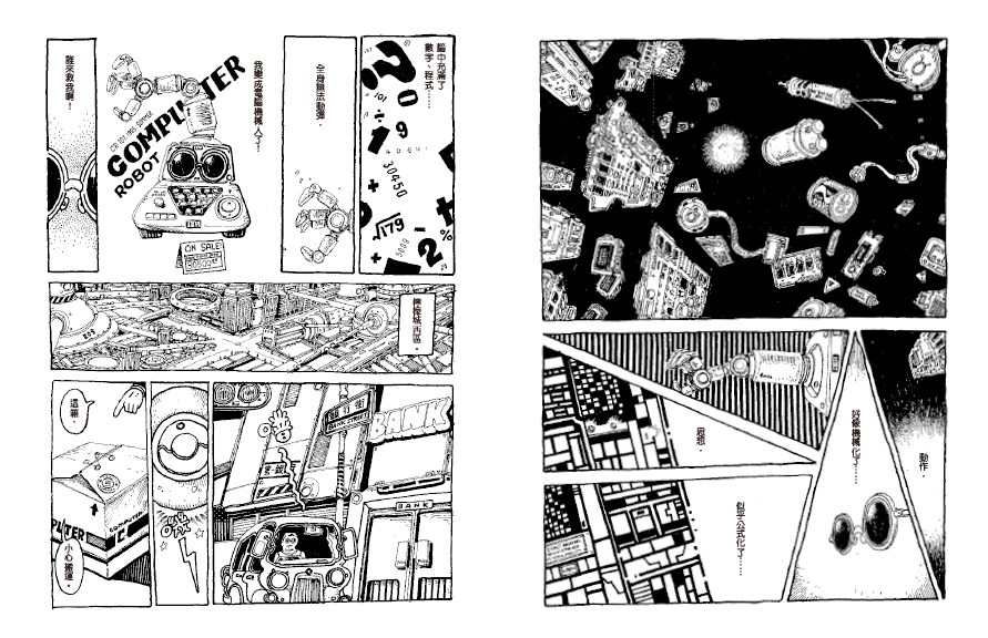 阿推的分鏡與其說是追求電影般的連續,更像是一張張幻燈片的投影。雖是連環漫畫的體例,但每一格不管構圖或小字的註解,又具有單格漫畫的意味,打造出奇異詭譎的節奏。格與格之間的敘事「時間」以不規則、不均質的方式彎曲進行,時而快轉,時而暫停,跳脫了線性運作的軌道。