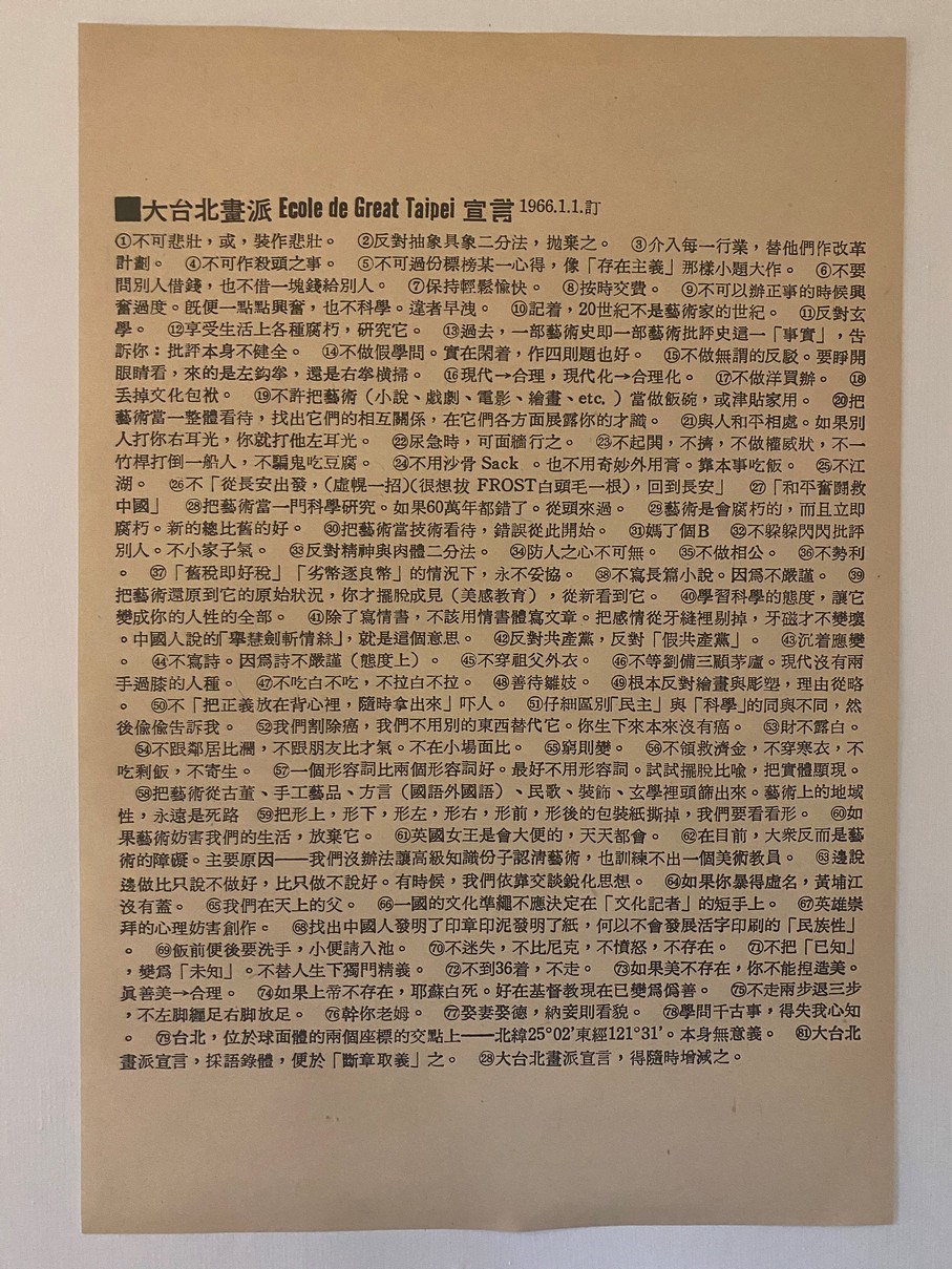 北美館做了〈大台北畫派宣言〉複印海報,在禮品區販售,我買了一幅,回家貼在書桌前的牆上。那份宣言裡,黃華成在第29條寫道,「藝術是會腐朽的,而且立即腐朽。新的總比舊的好。」