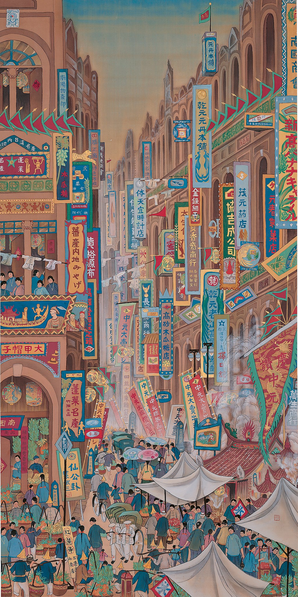 市井小民如我,想要看到〈南街殷賑〉,或許義美食品的大稻埕禮盒外包裝是個可能選項。郭雪湖以戲劇化手法描繪1930年代迪化街霞海城隍廟口的中元普渡,飛舞的旗幟與林立的招牌動靜相映,搭配著洋樓與擁擠人群,敏銳地以畫筆勾勒歷史日常,構圖嚴謹,繁中有序,一幅畫繪出近百年前的繁華。