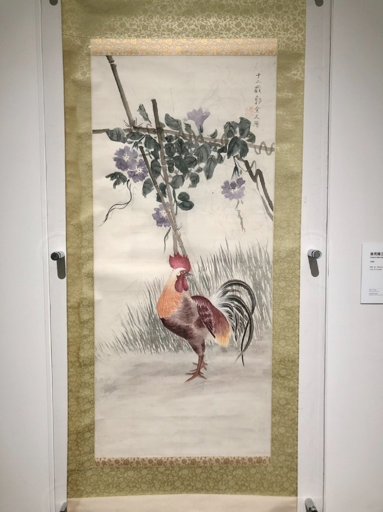 98公分乘以44公分的長卷,上頭有著一隻高壯挺立的公雞,尾巴黑色如柳枝,彷彿能動:雞身筆觸結實,胸前金黃色羽毛閃著光,眼神銳利往回頭看,炯炯如有神;畫作上方則有花葉棚架,紫色牽牛花錯落蔓延,生意盎然。望右上方一看,淡淡童稚的鉛筆筆觸寫著「12歲郭金火繪」,左側還落了印。