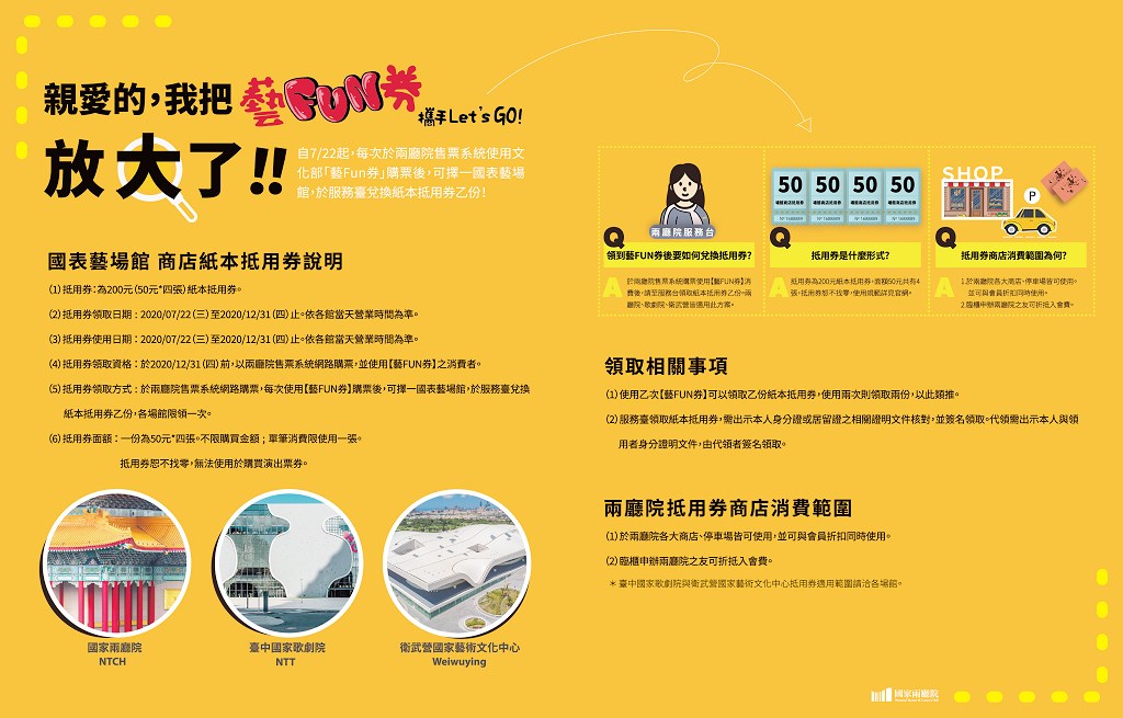 為協助台灣藝文產業度過武漢肺炎疫情衝擊,文化部三月十二日正式公告《文化部對受嚴重特殊傳染性肺炎影響發生營運困難產業事業紓困振興辦法》,近四個月完成了「藝文紓困1.0」、「藝文紓困2.0」兩階段審查,七月下旬將開啟振興計畫:發行六百元「藝FUN券」共兩百萬份,為行政院三倍券之外,文化部加碼推出的挺藝文振興方案。