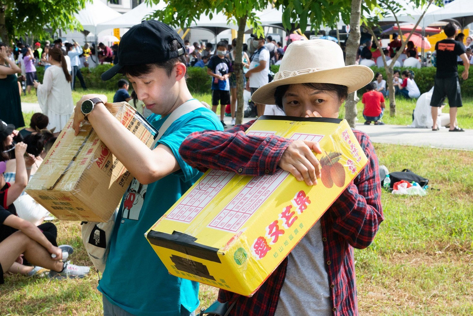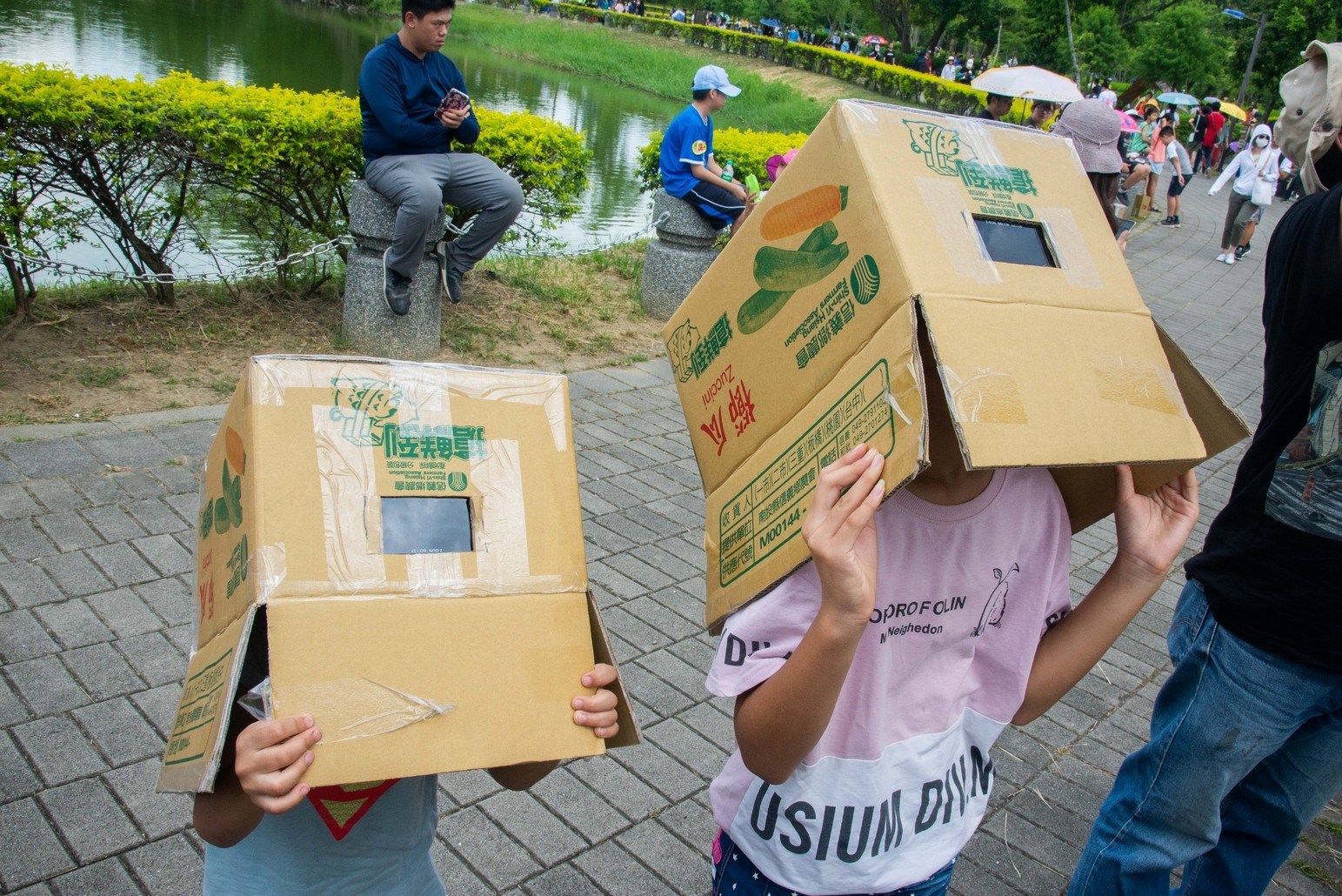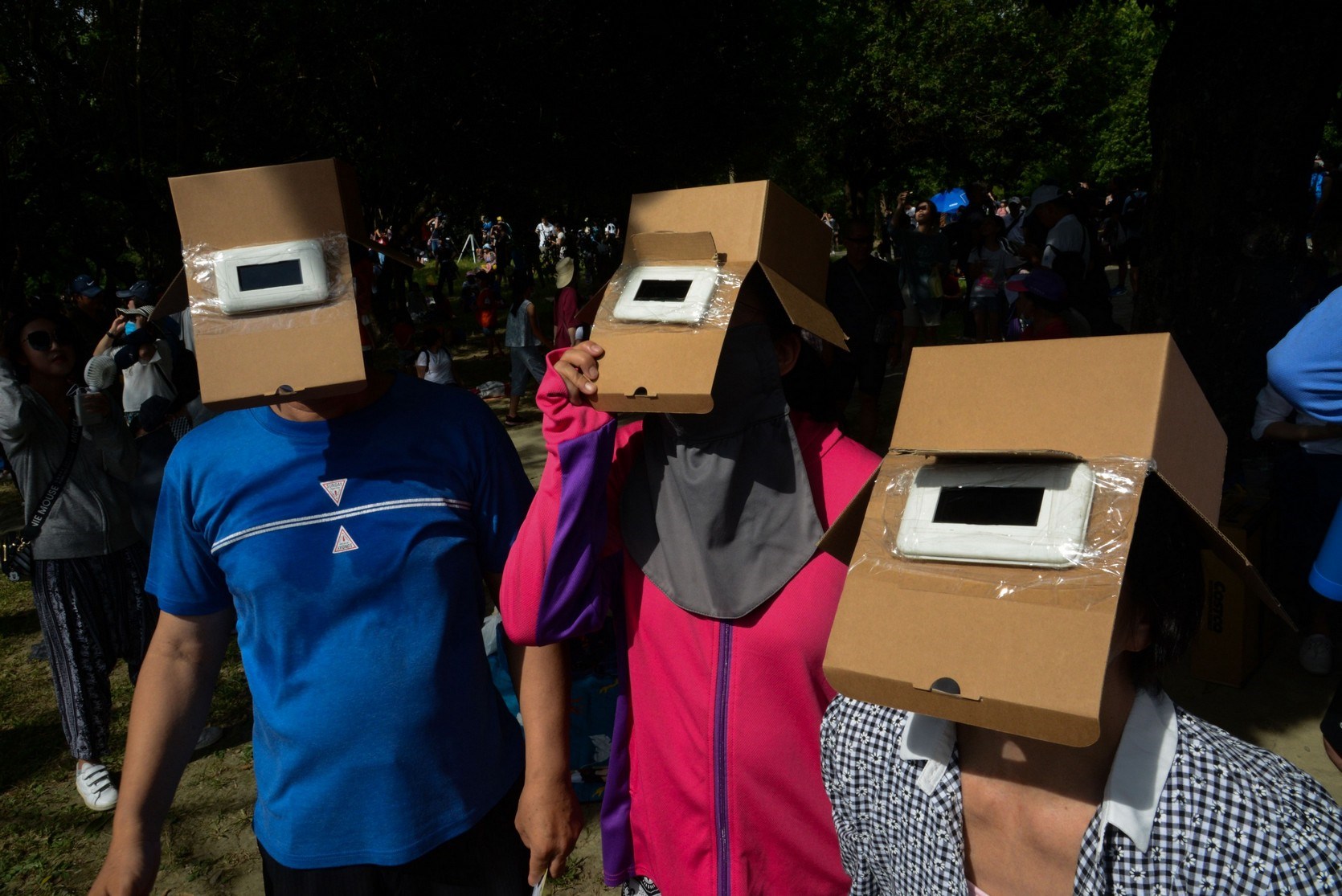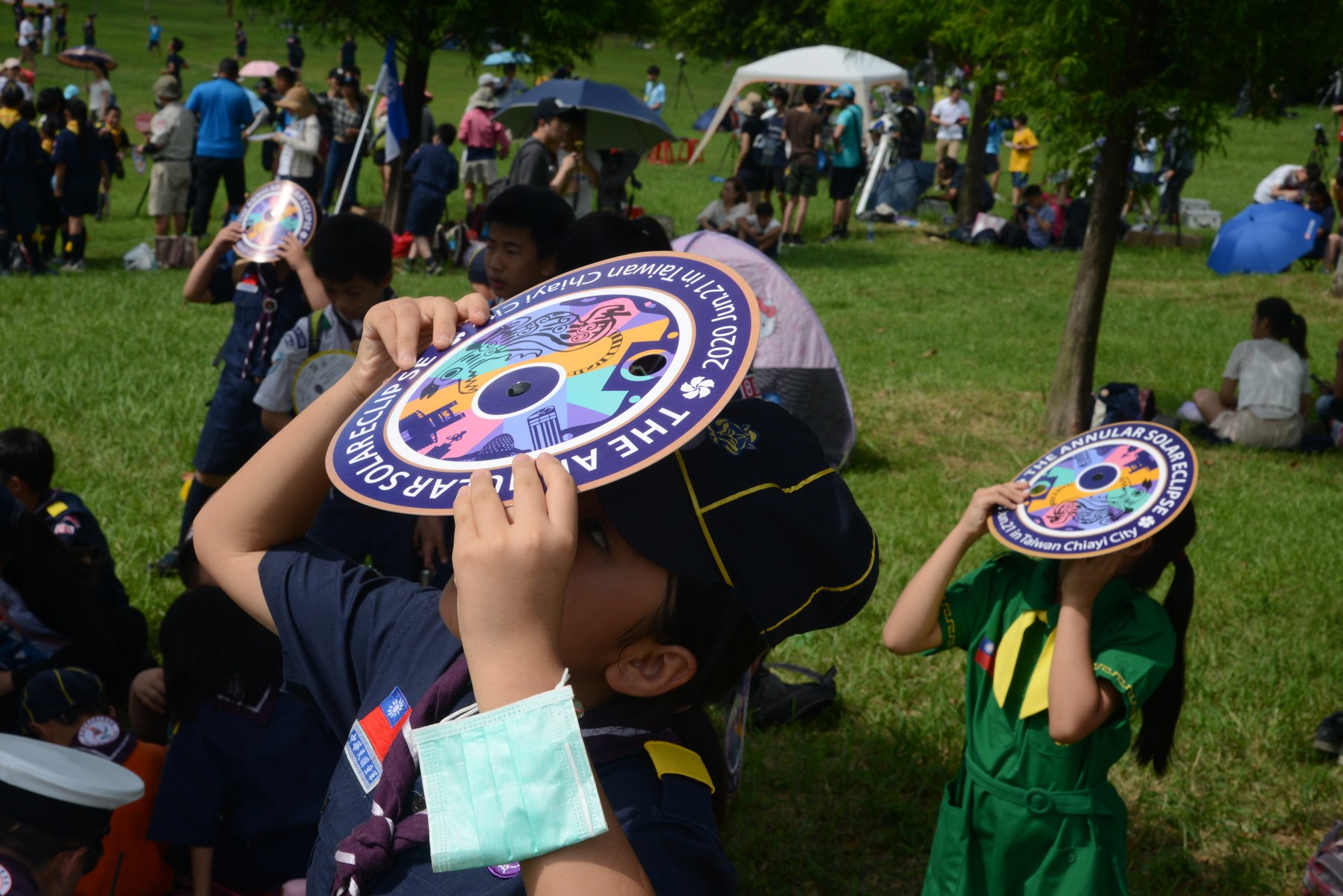 公園不到兩個小時內就擠滿人潮,有的家長帶著小孩躲在樹蔭下野餐,有的人拉著帳篷四處尋覓最佳位置,網美帶著講究的野餐墊和食物,專家備妥專業天文望遠鏡架在草坪上,有的人準備用水果紙箱自製的觀測器,一同等待日環食的到來。「這大概是這公園創立以來最多人的一次」,一位揮動扇子的老先生在樹蔭下這麼說。