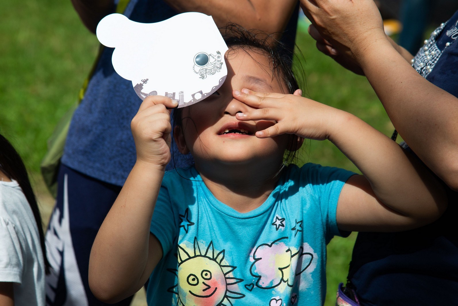 倒數著3-2-1,月亮真的把太陽蓋住了。特地穿著太陽圖案衣服的小女孩,透過濾片直呼著「真的哎!真的不見了!被吃掉了!」一旁的狗也緊張得亂叫。尖叫後逐漸恢復寧靜,周遭空間像是被關了燈,短短幾秒鐘,光線降了一些,感覺像是正在進行某種宗教儀式,直到一切又恢復正常。