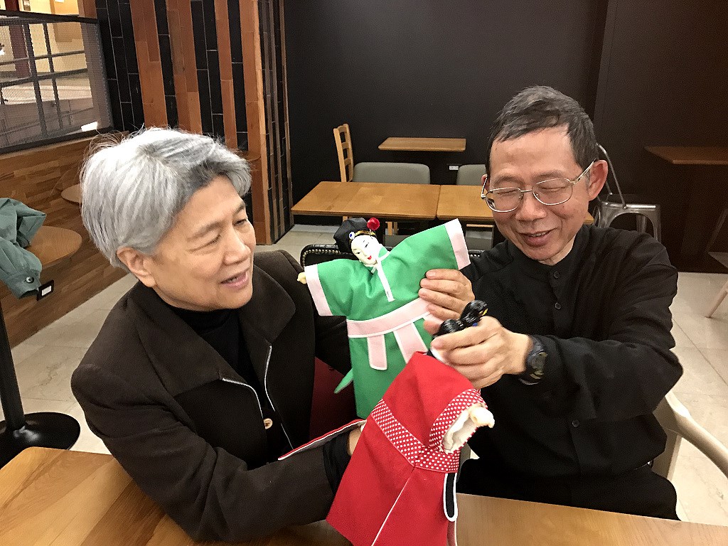 老師也是我認識最喜歡歌唱的作曲家之一,聊到哪一首樂曲時,老師總會開嗓高唱個幾句,完全不忌諱周圍還有哪些人。之前台北市立國樂團委託他寫台語歌劇「李天祿的四個女人」,還去學了布袋戲,專訪時他從包包內摸出兩尊偶,一個穿綠色,是他自己;另一尊穿紅色,他拿給師母,手掌伸進去後就跟師母開始對演,還邊唸著歌劇中的老鴇橋段,越唸越開心。