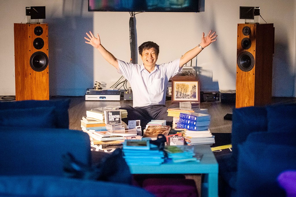 交代了醉心音樂的起點,張天立迫不及待地拉著攝影師與我坐到音響前,「我一定要讓你們親自體驗一下,體驗完我要聽你們的心得。」話還沒完,他就忙著滑手機找曲目,突然想起雜音會干擾,又忙著嚷助理關了冷氣,燈也熄了,室內寧靜下來,凝結成一片黑暗。
