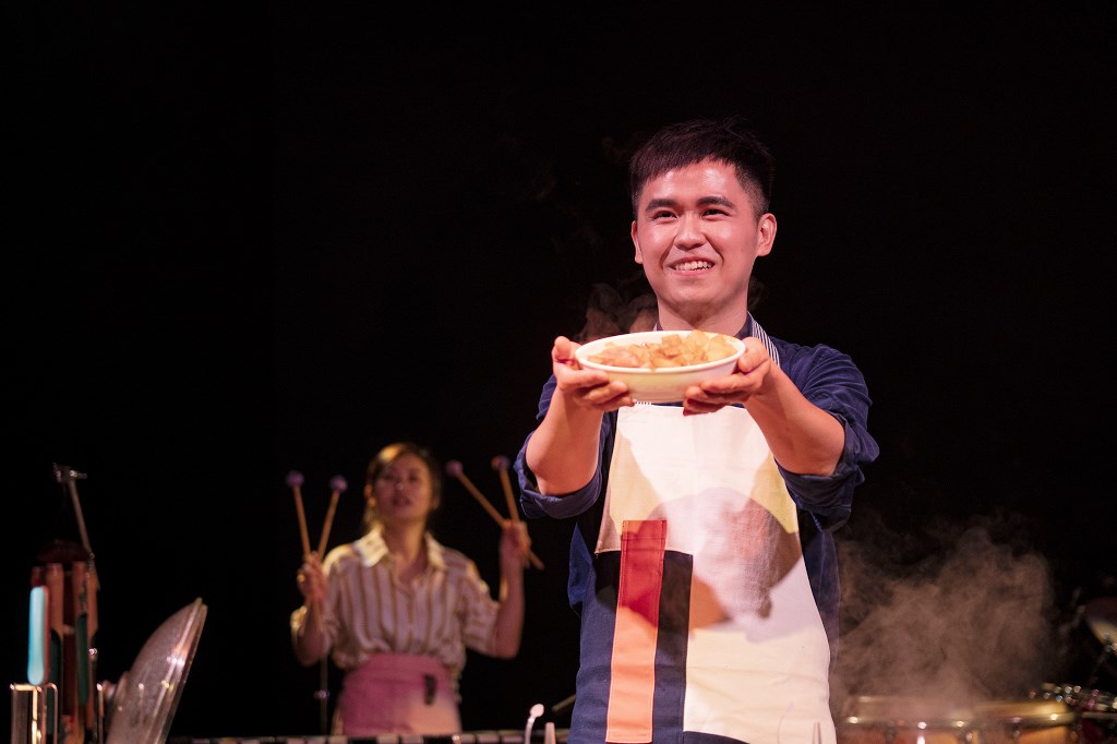 從菜色的詮釋裡,建立出樂曲與人類情感的糾葛,運用擊樂、物件、角色、佳餚等千變萬化的豐富聲響,疊加、交織出與眾不同,具劇場性格的音樂會。鼓聲有時候彷彿菜市場內的人聲喧嘩,有時又像小和尚對於大石頭引起不同反應的驚奇,但這個橋段,其實是高瀚諺心心念念,傳遞的是一個父親對兒子的愛。
